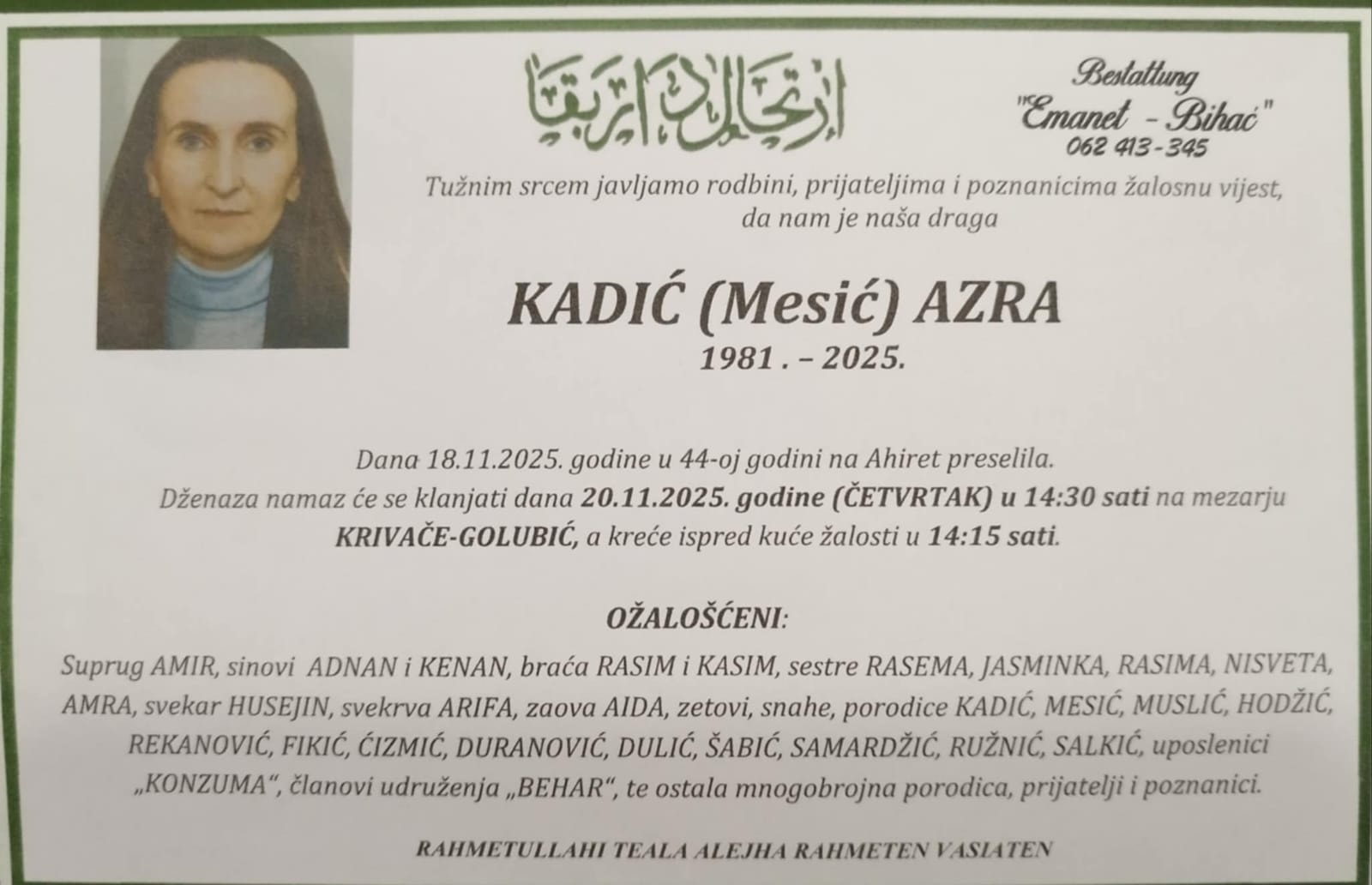 Tužnim srcem javljamo rodbini, prijateljima i poznanicima žalosnu vijest da nam je naša draga KADIĆ (Mesić) AZRA dana 18.11.2025. godine u 44-oj godini na Ahiret preselila.