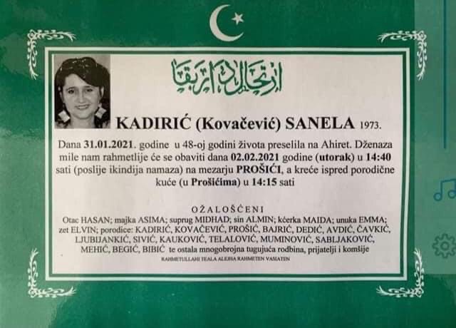Tužnog srca i s bolom u duši obavještavamo rodbinu, komšije i prijatelje da je naša draga Kadirić (Kovačević) Sanela, dana 31.01.2021. godine, u 48-oj. godini života, preselila na Ahiret.