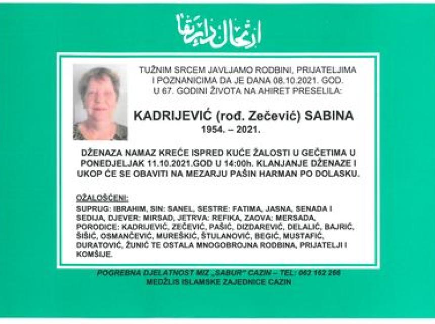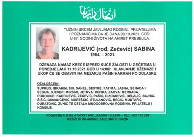 Tužnog srca i s bolom u duši obavještavamo rodbinu, komšije i prijatelje da je naša draga Kadrijević (rođ. Zečević) Sabina, dana 08.10.2021 godine, u 67-oj godini života, preselila na Ahiret.