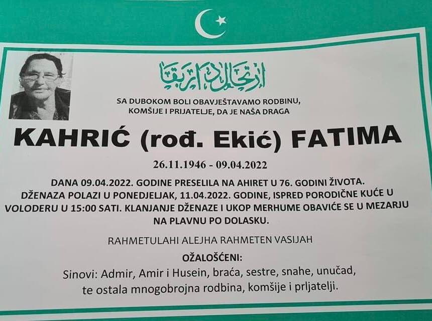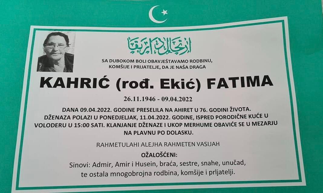 Tužnog srca i s bolom u duši obavještavamo rodbinu, komšije i prijatelje da je naša draga Kahrić (rođ. Ekić) Fatima, dana 09.04.2022. godine, u 76-oj godini života, preselila na Ahiret.
