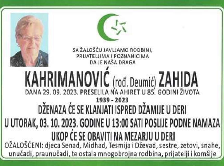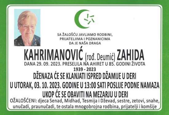 SA ZALOSCU JAVLIAMO RODBINI, PRIJATELJIMA | POZNANICIMA DA JE NASA DRAGA KAHRIMANOVIC (DEUMIĆ) ZAHIDA DANA 29. 09. 2023. PRESELILA NA AHIRET U 85. GODINI ZIVOTA.