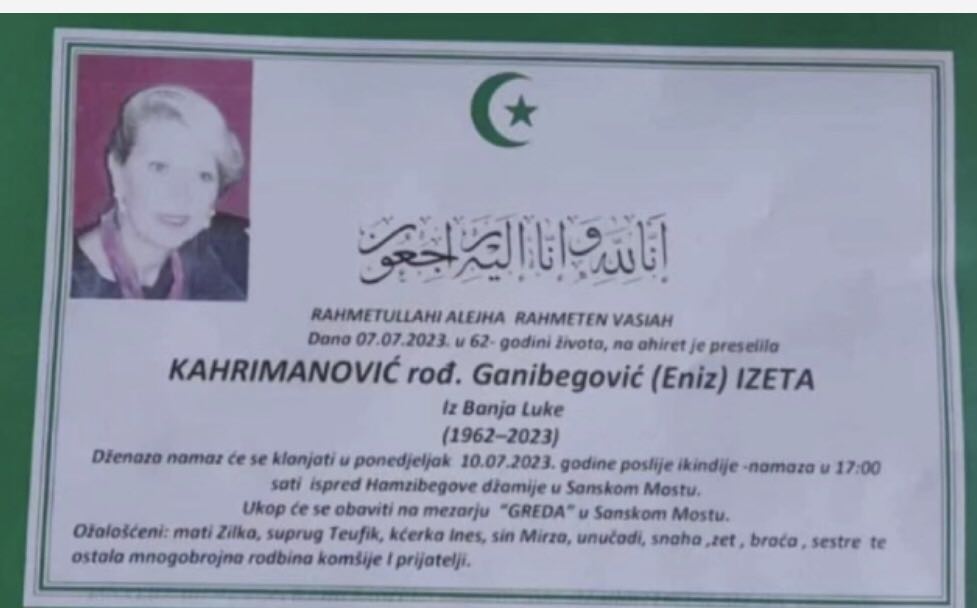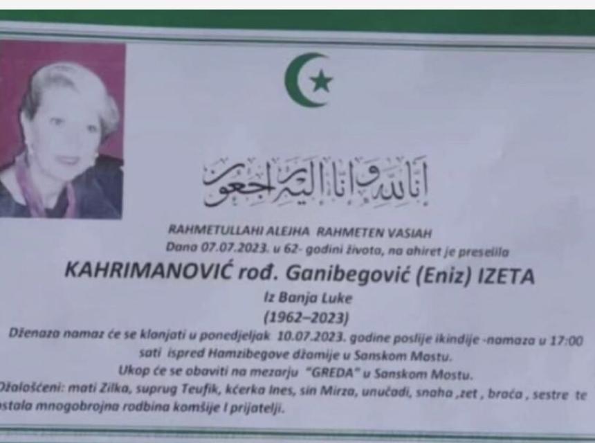 Tužnim srcem i bolom u duši javljamo rodbini, komšijama i prijateljima da je naša draga Kahrimanović rođ. Ganibegović (Eniz) Izeta, u 62-oj godini života, preselila na Ahiret.