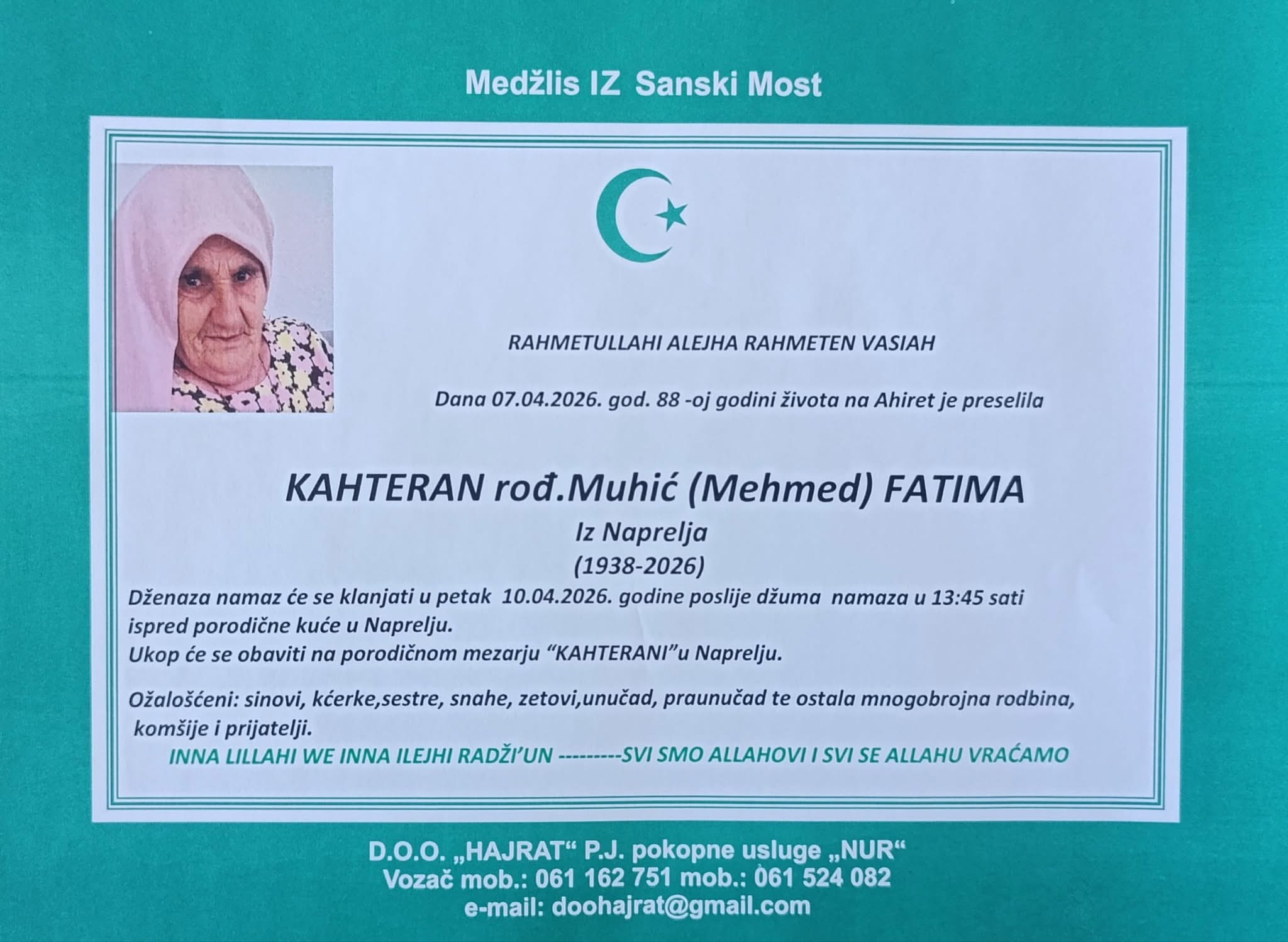 Dženaza-namaz će se klanjati u petak, 10.04.2026. godine, poslije džuma-namaza u 13:45 sati ispred porodične kuće u Naprelju.