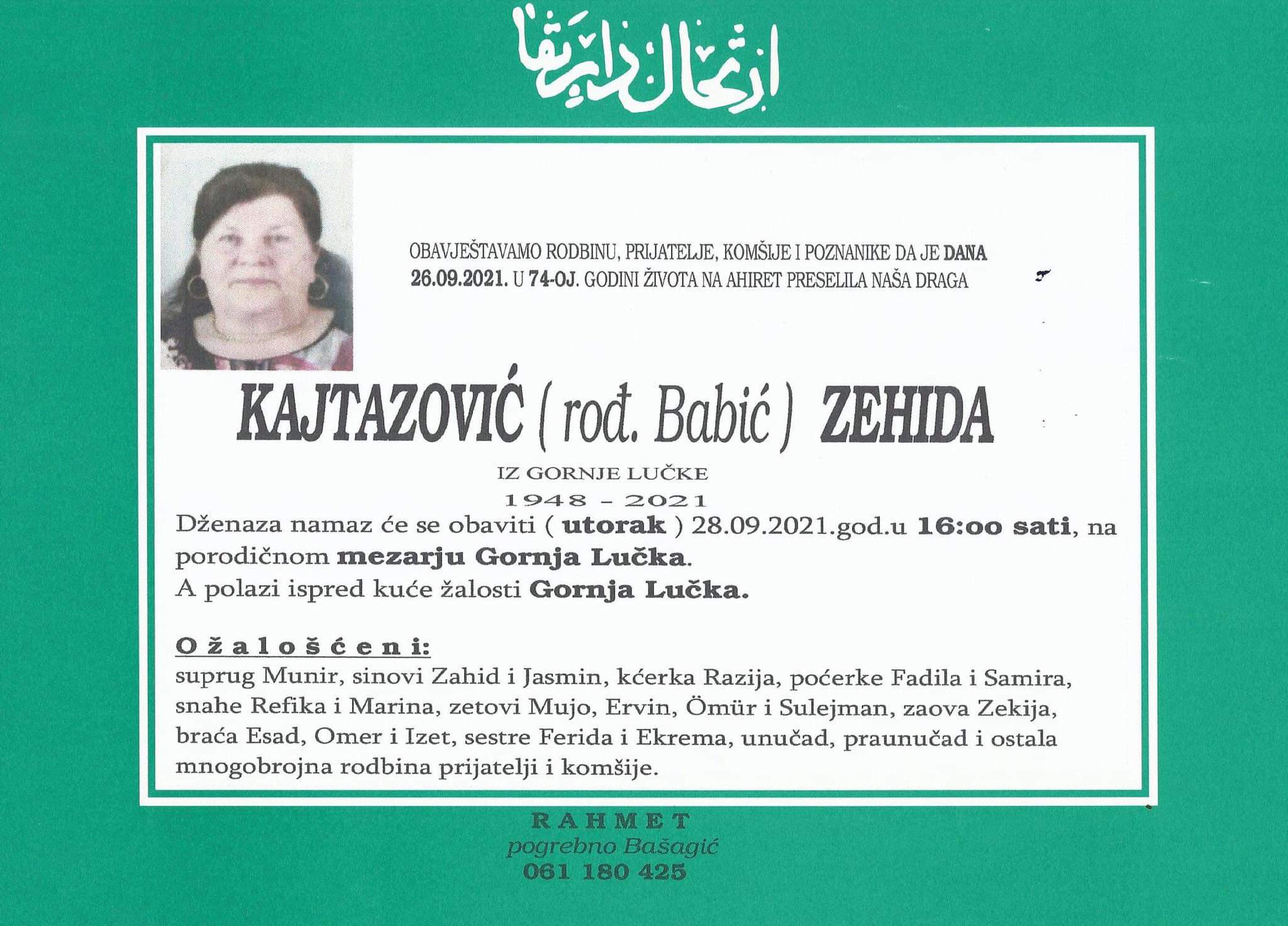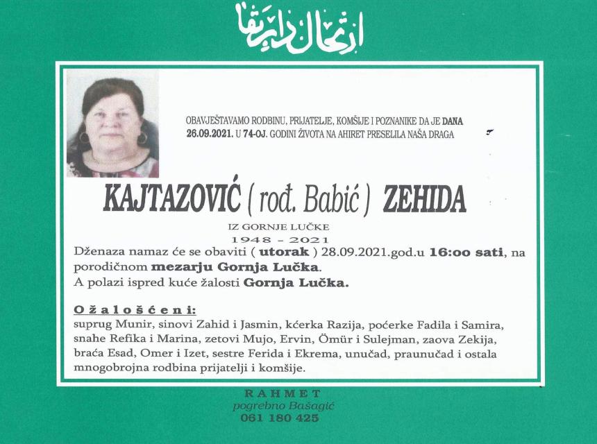 Tužnog srca i s bolom u duši obavještavamo rodbinu, komšije i prijatelje da je naša draga Kajtazović (rođ. Babić) Zehida dana 26.09.2021. godine, u 74. godini života, preselila na ahiret.