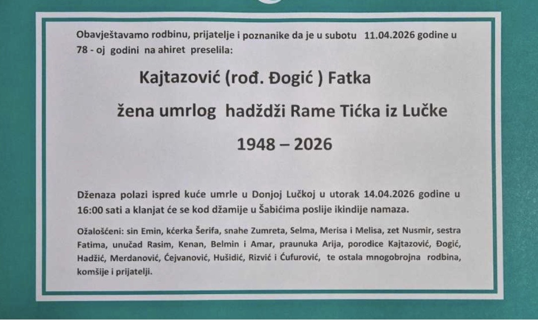 Dženaza polazi ispred kuće umrle u Donjoj Lučkoj u utorak, 14.04.2026. godine u 16:00 sati, a klanjat će se kod džamije u Šabićima poslije ikindije-namaza.