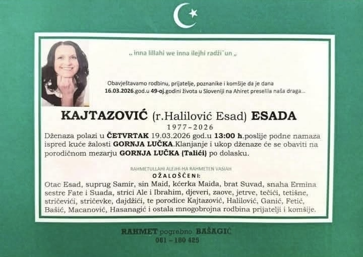 Obavještavamo rodbinu, prijatelje, poznanike i komšije da je dana 16.03.2026. godine, u 49. godini života, u Sloveniji na Ahiret preselila naša draga