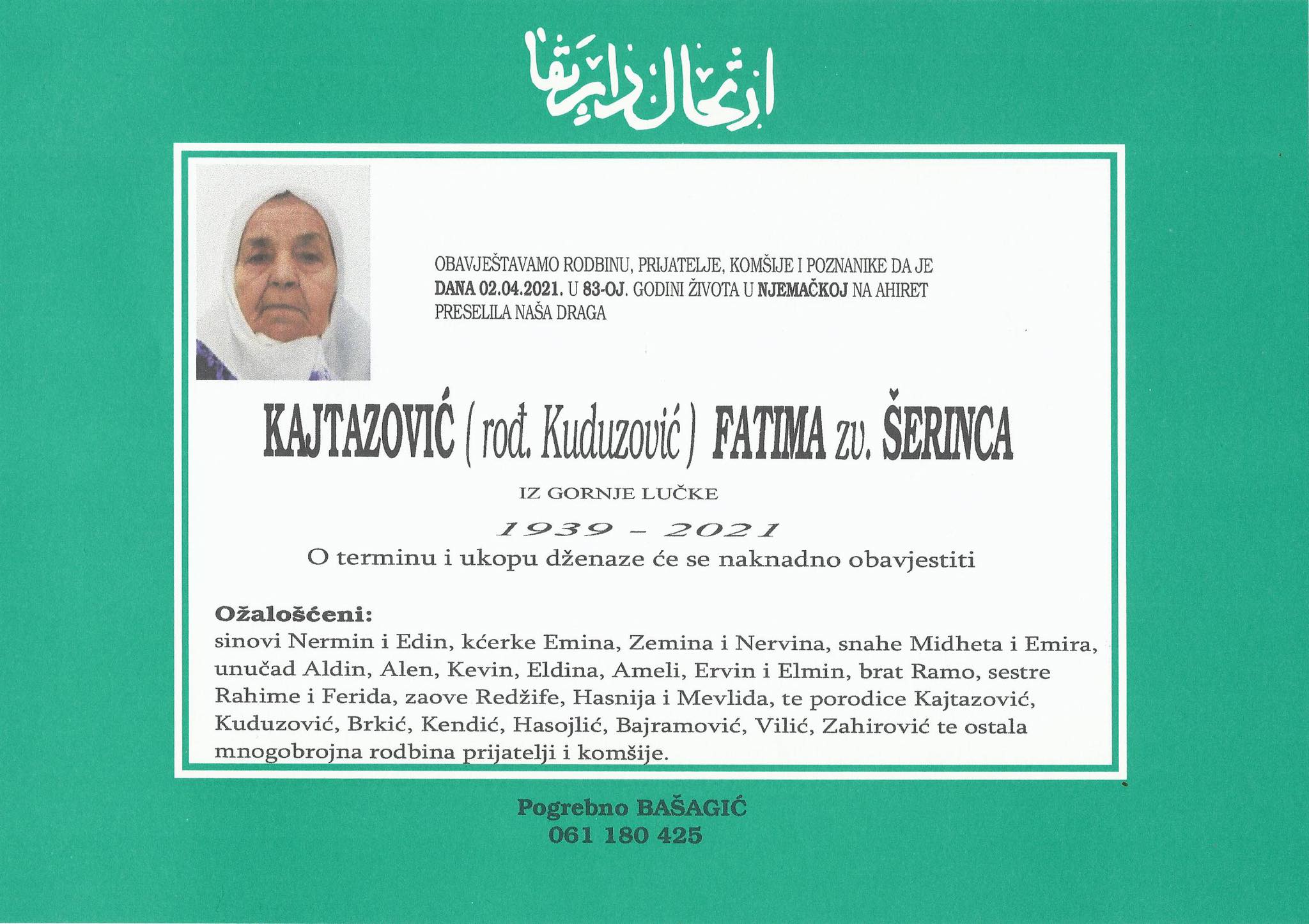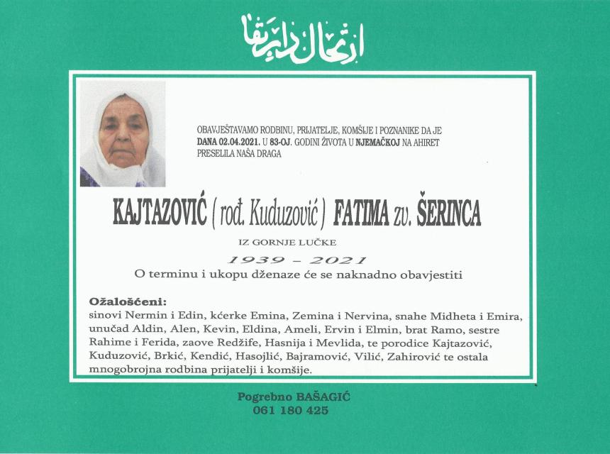 Tužnog srca i s bolom u duši obavještavamo rodbinu, komšije i prijatelje da je naša draga Kajtazović (rođ. Kuduzović) Fatima zv. Šerinca, dana 02.04.2021 godine, u 83-oj godini života, preselila na Ahiret.