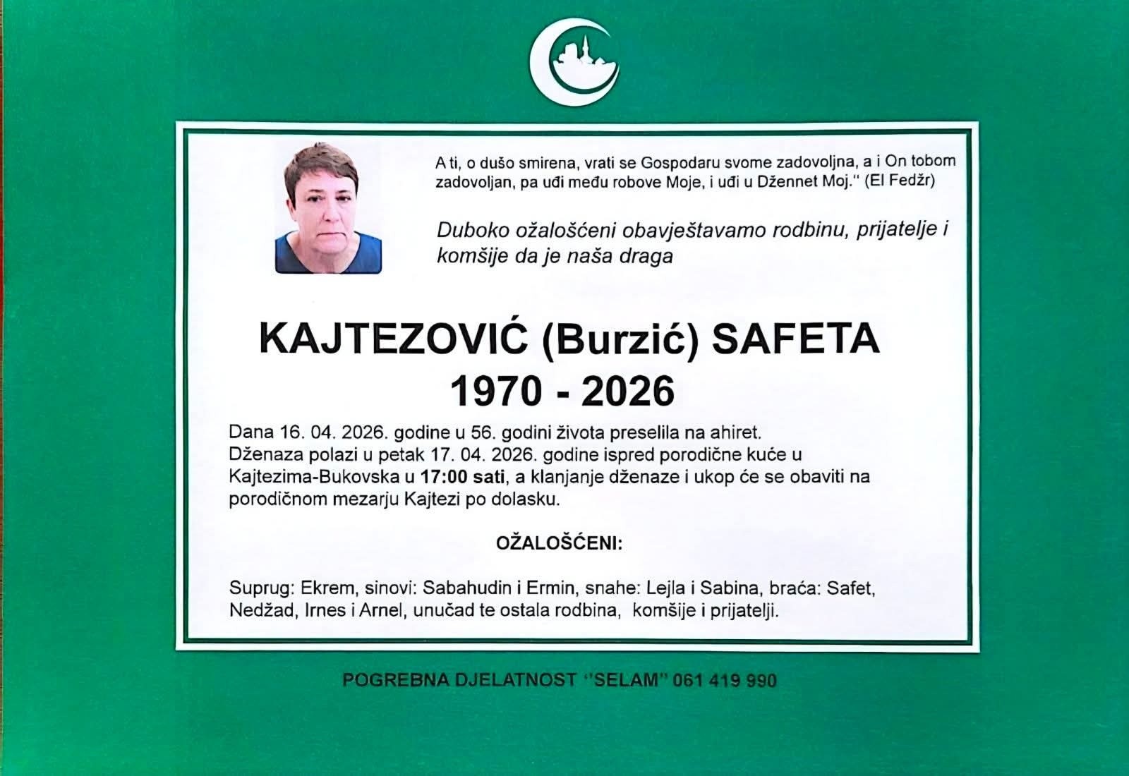 Dženaza polazi u petak 17. 04. 2026. godine ispred porodične kuće u Kajtezima-Bukovska u 17:00 sati, a klanjanje dženaze i ukop će se obaviti na porodičnom mezarju Kajtezi po dolasku.