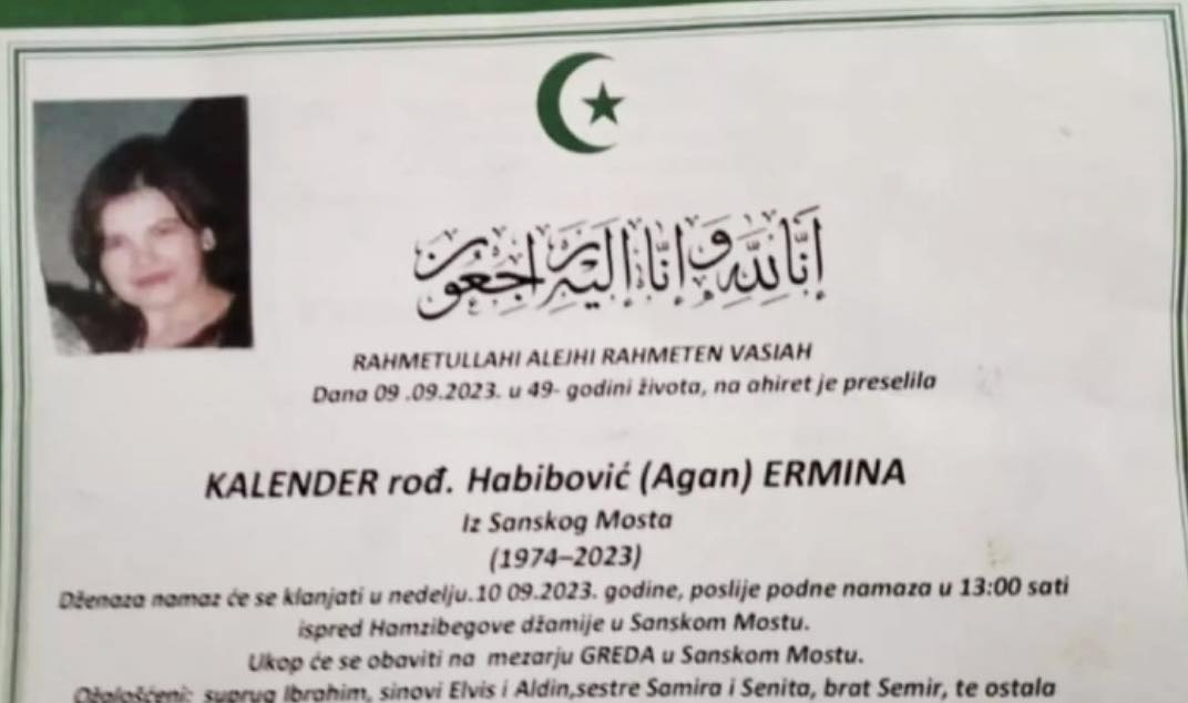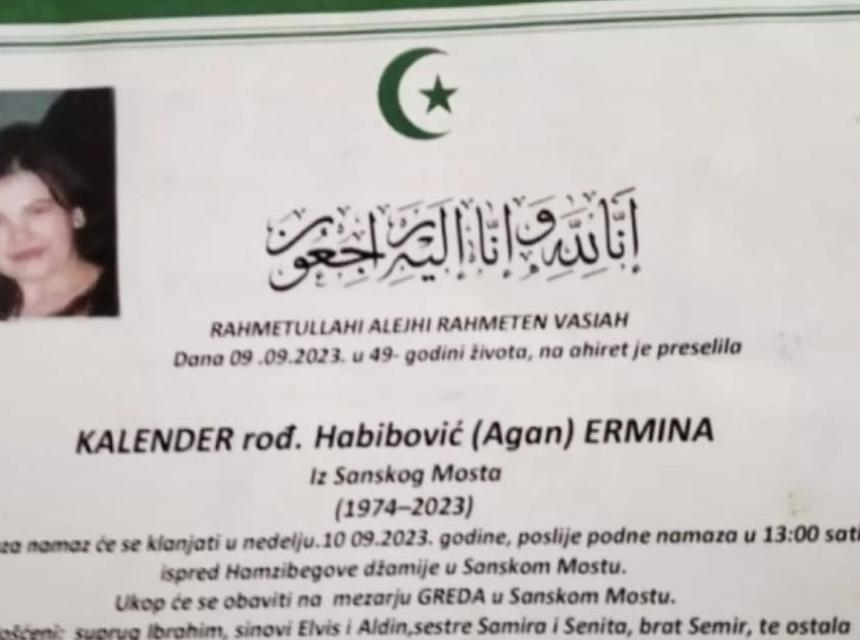 Dana 09.09.2023. u 49- godini života, na ahiret je preselila KALENDER rod. Habibović (Agan) ERMINA Iz Sanskog Mosta.