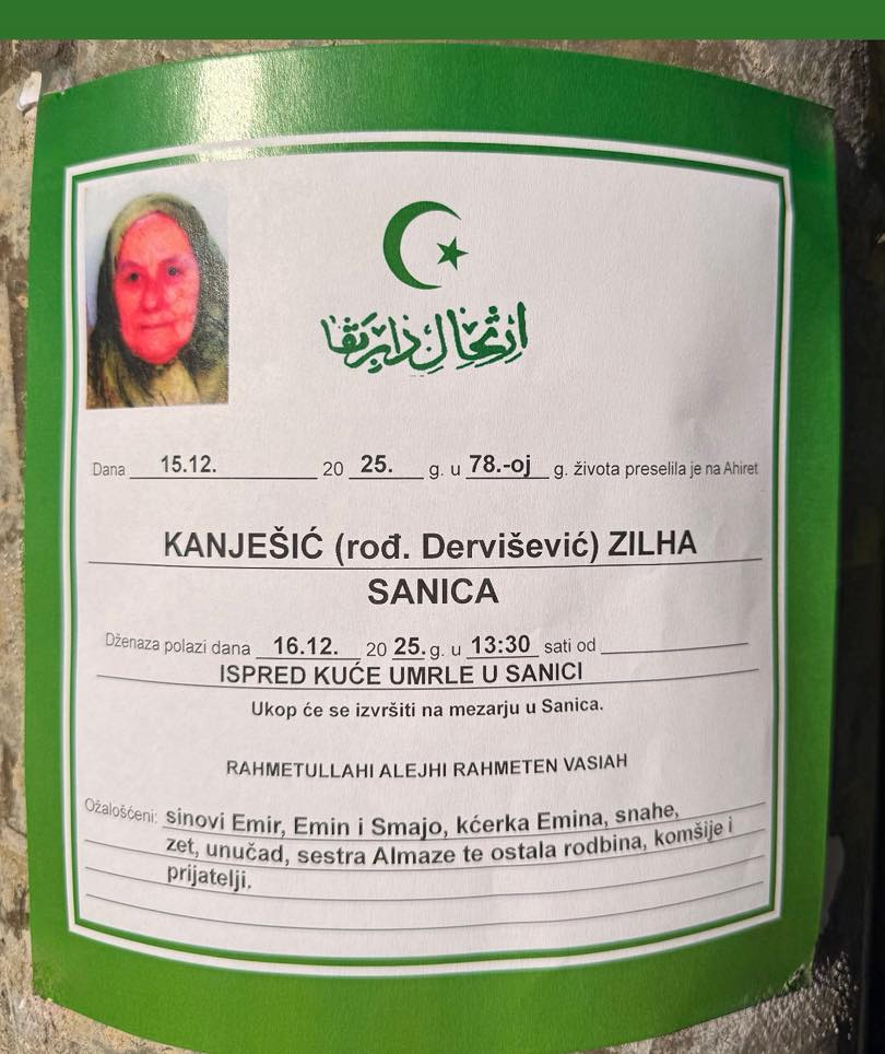 Dženaza polazi dana 16.12. 2025. g. u 13:30 sati ISPRED KUĆE UMRLE U SANICI.