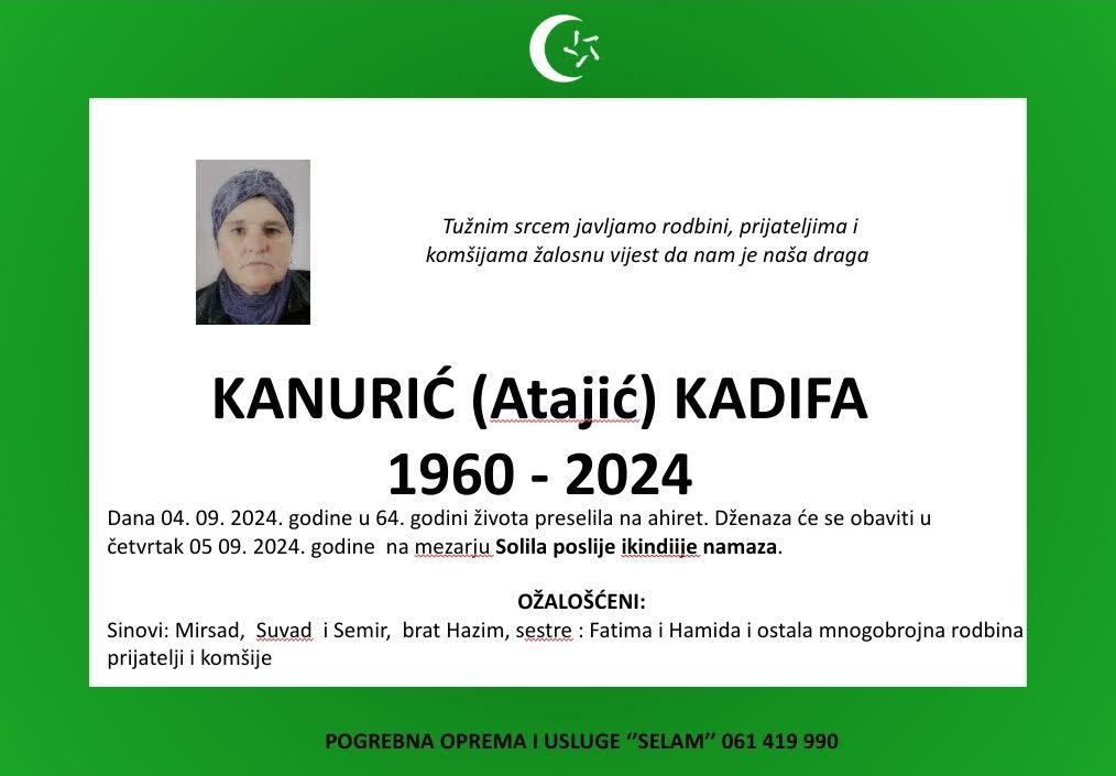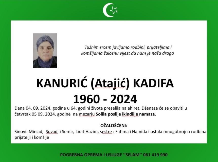 Obaviještavamo rodbinu, prijatelje,poznaniike i komšije da je dana 04.09.2024. god. u 64-oj godini života na Ahiret preselila Kanurić (Atajić) Kadifa.