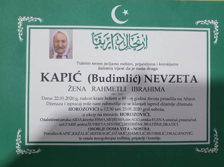 Tužnim srcem javljamo rodbini, prijateljima i komšijama žalosnu vijest da je nađa draga Kapić (Budimlić) Nevzeta žena rahmetli Ibrahima dana 22.01.2020.g. nakon kraće bolesti u 89-oj godini života preselila na Ahiret. Dženaza i ispraćaj mile nam rahmetlije će se klanjati ispred džamije džemata Horozovići u 12:30 sati 25.01.2020 god subota, a ukop na mezarju Horozovići.