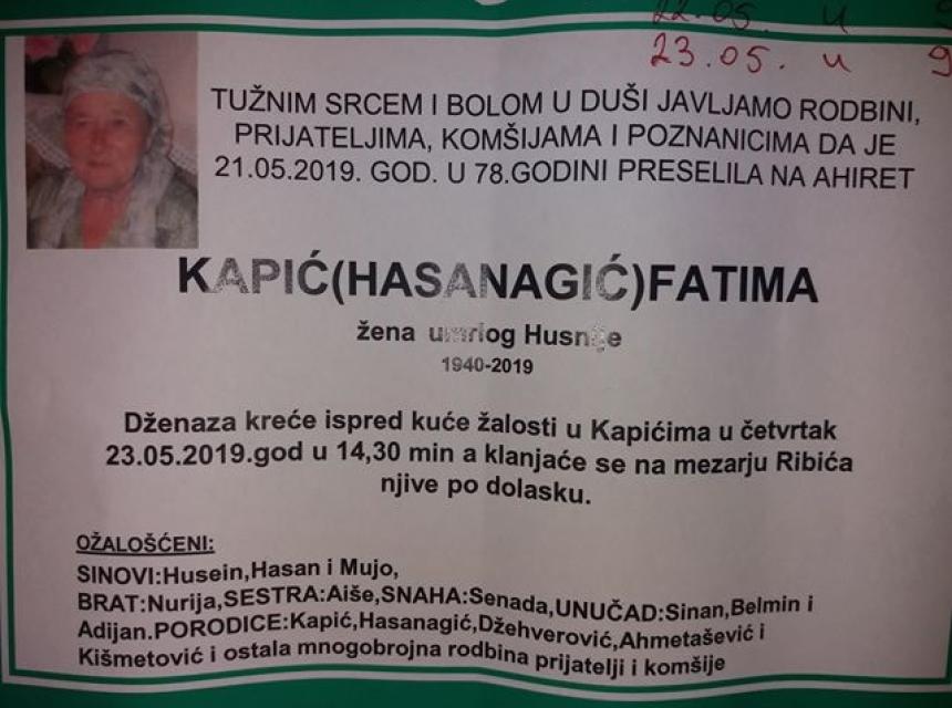 Dženaza kreće ispred kuće žalosti u Kapićima u četvrtak 23. 05. 2019. godine u 14:30 minuta, a klanjat će se na mezarju Ribića njive po dolasku.