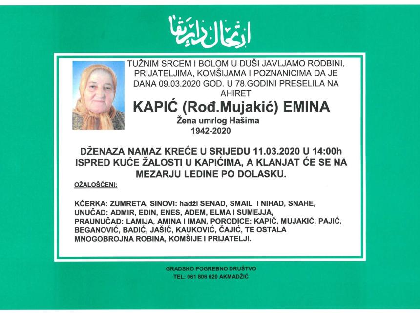 Tužnog srca i s bolom u duši javljamo rodbini, košijama i prijateljima da je naša draga Kapić(Mujakić) Emina, žena umrlog Hašima, dana 09.03.2020. godine u 78. godini života preselila na Ahiret.