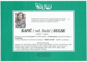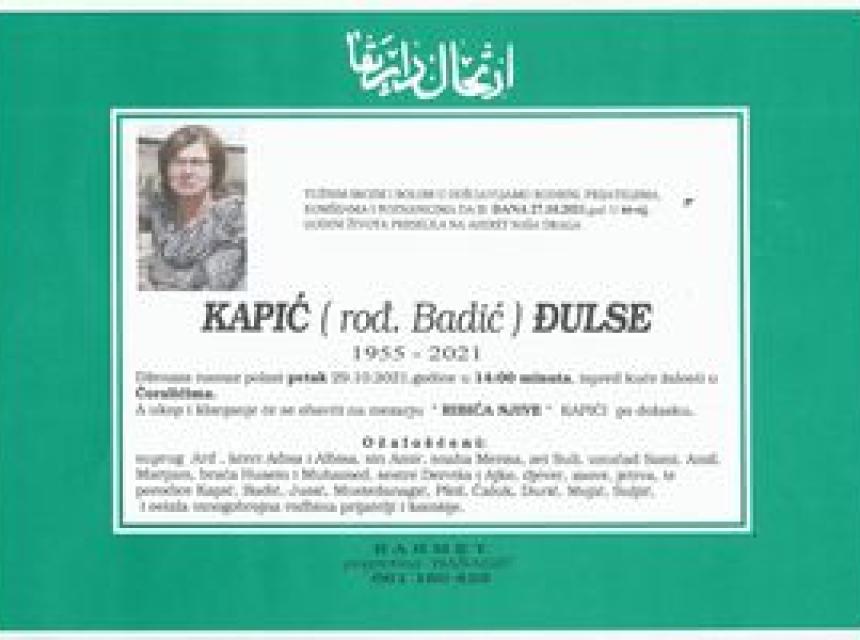 Tužnog srca i s bolom u duši obavještavamo rodbinu, komšije i prijatelje da je naša draga Kapić (rođ. Badić) Đulse dana 27.10.2021. u 66. godini života preselila na ahiret.