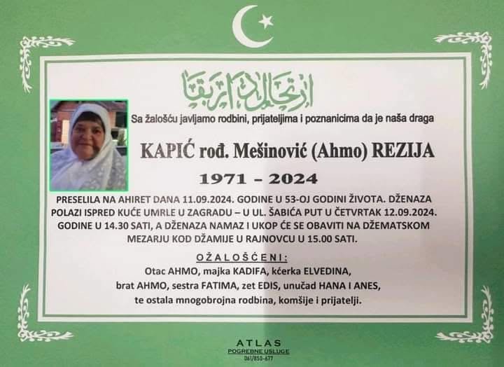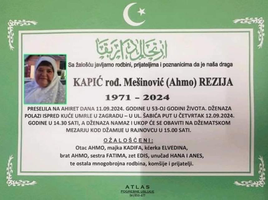 Tužnim srcem i bolom u duši javljamo rodbini, prijateljima i komšijama da je naša draga Kapić rođ. Mešinović (Ahmo) Rezija, dana 11.09.2024. godine u 53-oj godini života preselila na Ahiret.