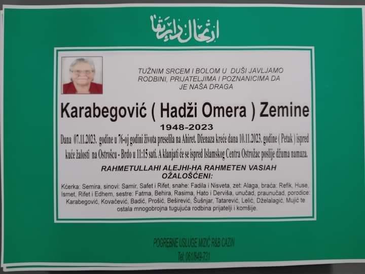 Tužnim srcem javljamo rodbini, prijateljima i poznanicima da je dana 07.11.2023. god u 76. godini života na Ahiret preselila Karabegović (hadži Omera) Zemine.