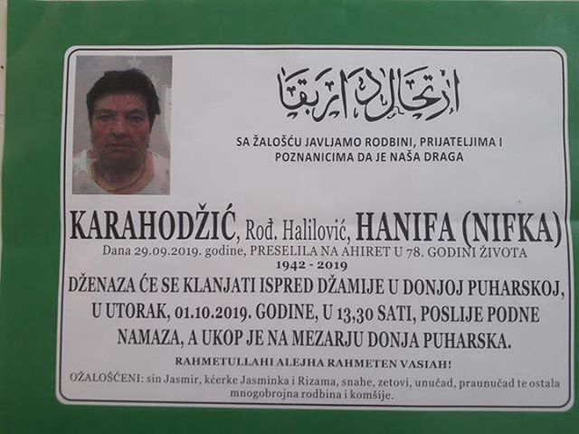 Sa žalošću javljamo rodbini, prijateljima i poznanicima da je naša draga Karahodžić Hanifa (Nifka) dana 29.09.2019. godine preselila na Ahiret u 78-oj godini života.