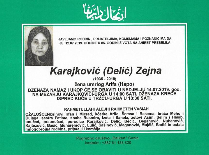 Javljamo rodbini, prijateljima, komšijama i poznanicima da je dana 12.07.2019. godine u 85. godini života na Ahiret preselila Karajković (Delić) Zejna, žena umrlog Arifa (Hapo).