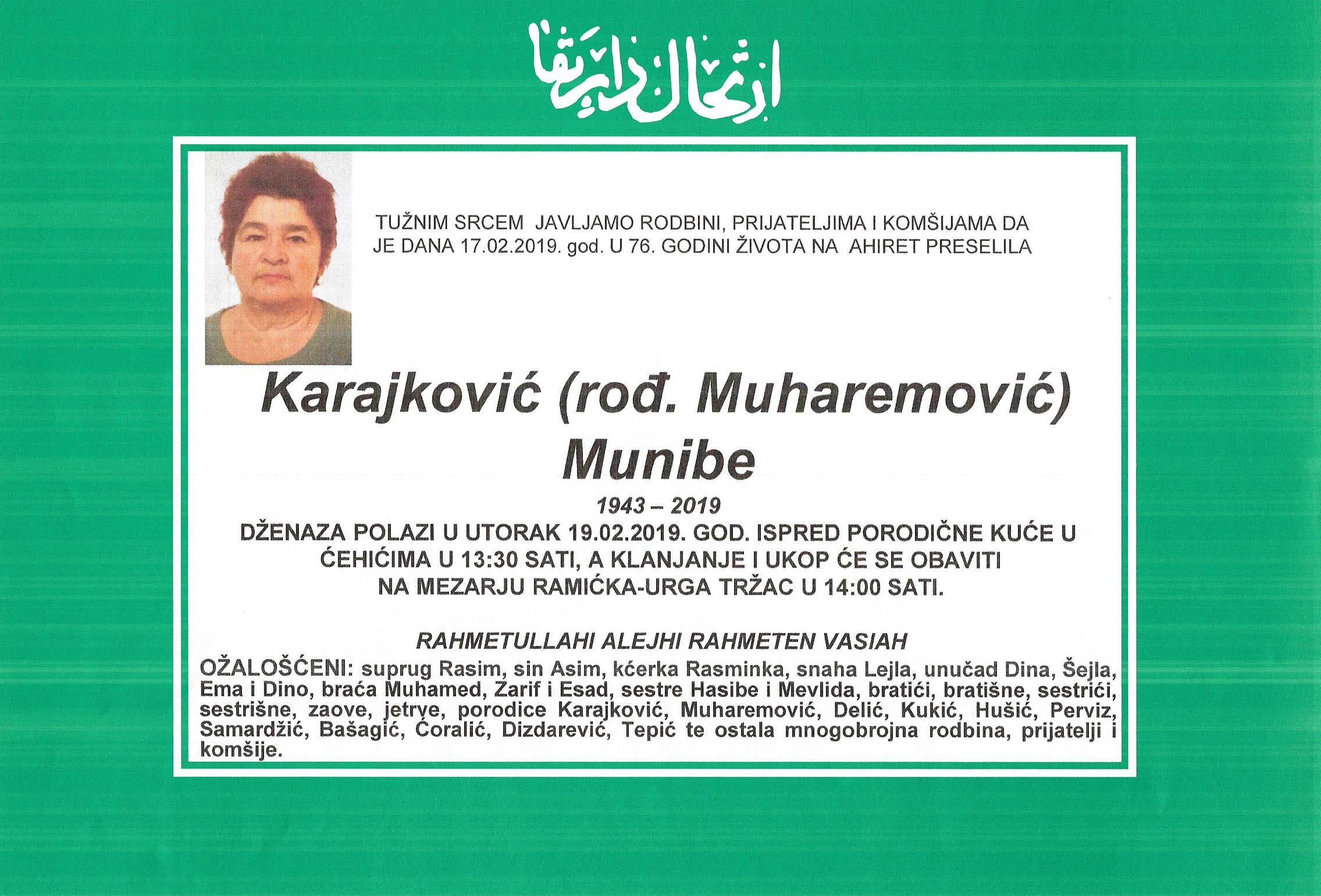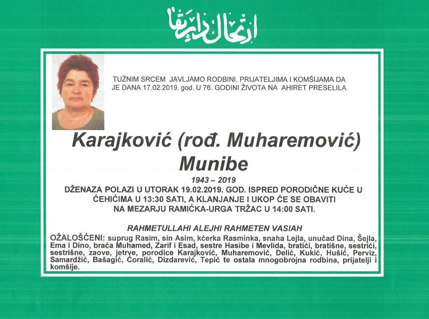 Tužnim srcem javljamo rodbini, prijateljima i komšijama da je dana 17.02.2019. god u 76. godini života na Ahiret preselila Karajković (rođ. Muharemović) Munibe.