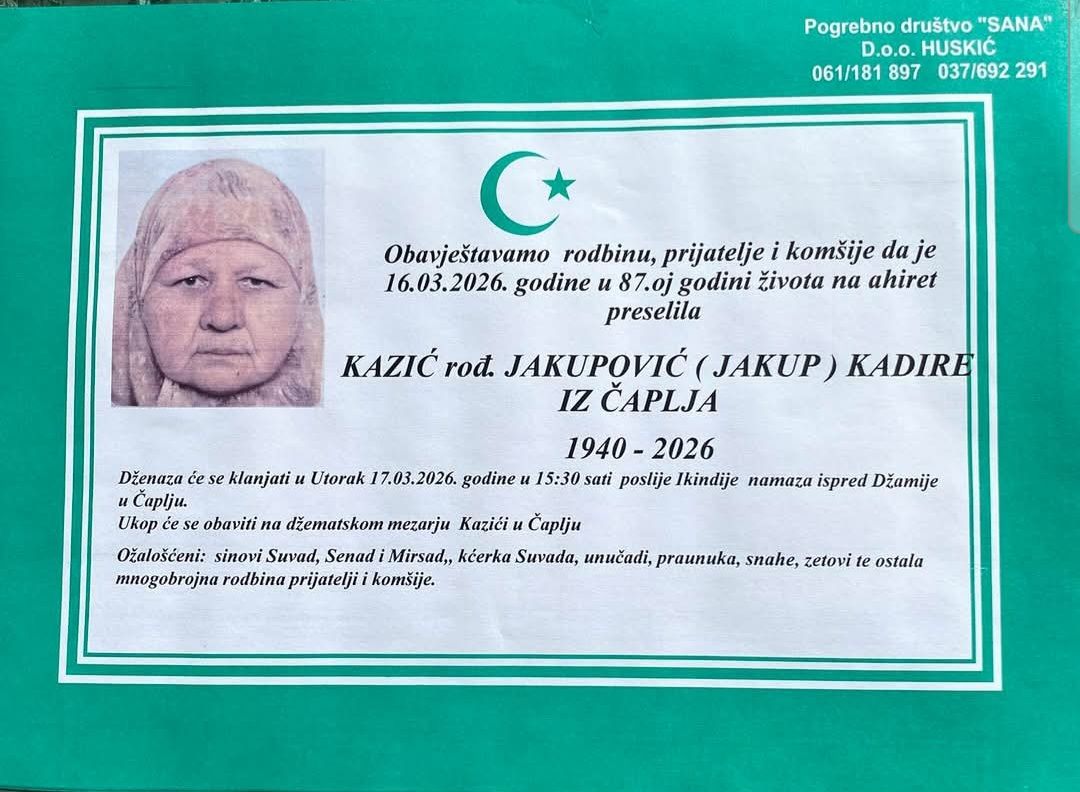 Dženaza će se klanjati u utorak 17.03.2026. godine u 15:30 sati poslije Ikindije namaza ispred Džamije u Čaplju.