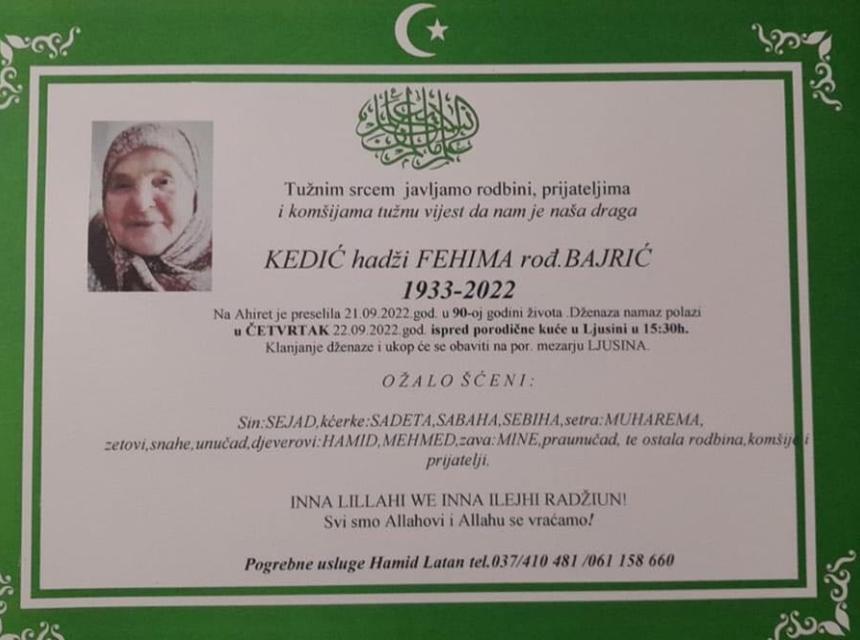 Tužnim srcem i bolom u duši javljamo rodbini, prijateljima i komšijama da je dana 21.09.2022.god. u 90-oj godini života na Ahiret preselila Kedić hadži Fehima rođ. Bajrić.