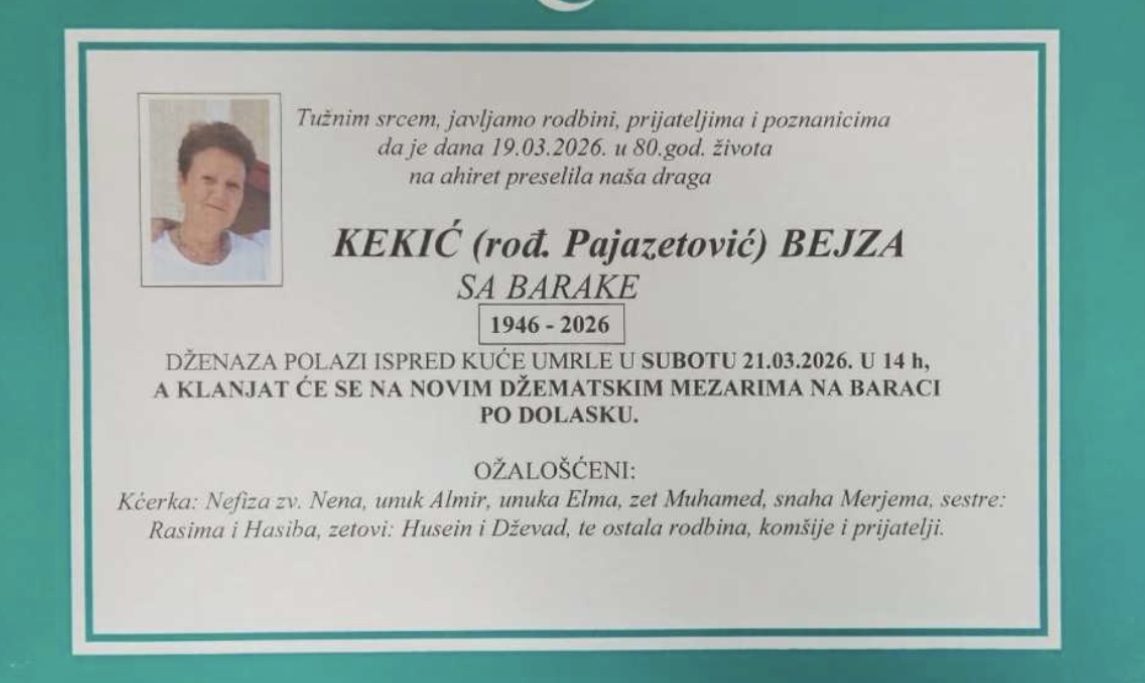 Dženaza polazi ispred kuće umrle u subotu 21.03.2026. u 14 h, a klanjat će se na novim džematskim mezarima na Baraci po dolasku.