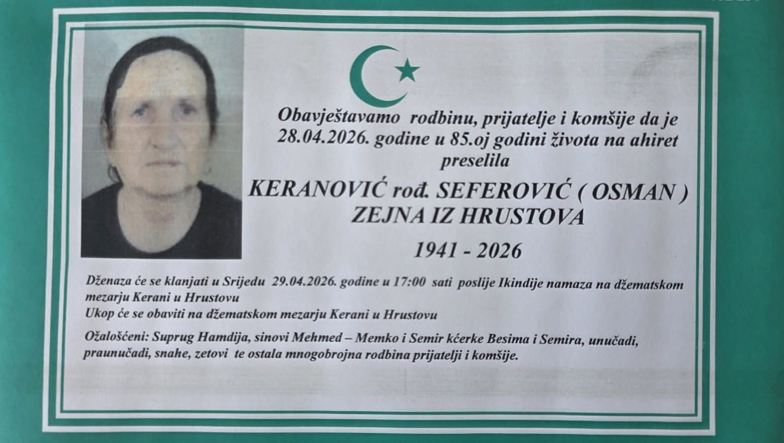 Dženaza će se klanjati u Srijedu 29.04.2026. godine u 17:00 sati poslije Ikindije namaza na džematskom mezarju Kerani u Hrustovu.