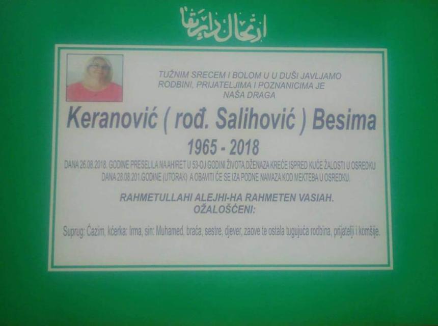 Tužnim srcem i bolom u duši javljamo rodbini, prijateljima, komšijama i poznanicima da je dana 26.08.2018. godine u 53-oj. godini života na Ahiret preselila Keranović (rođ.Salihović) Besima.