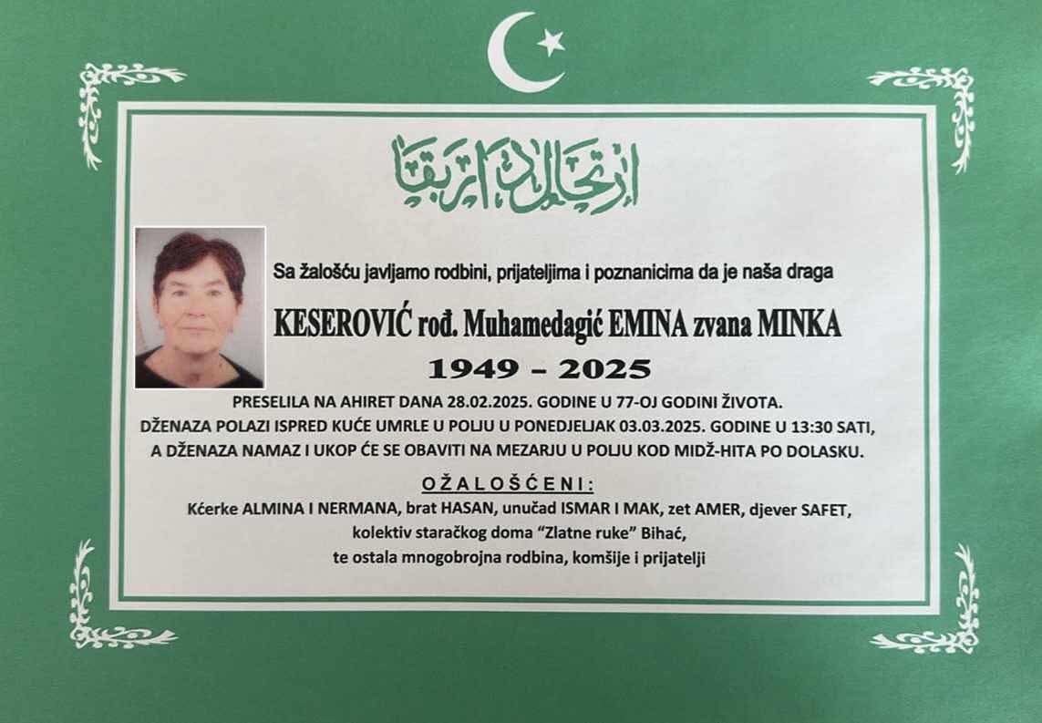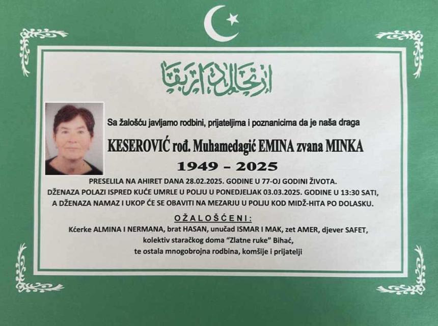 Preselila na ahiret dana 28.02.2025.godine u 77-oj godini života. Dženaza kreće ispred kuće umrle u POLJU u ponedeljak 03.03.2025.godine u 13:30 sati, a dženaza i ukop će se obaviti na mezarju u POLJU kod Midž-hita po dolasku.
