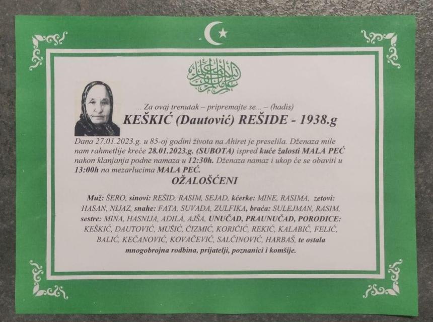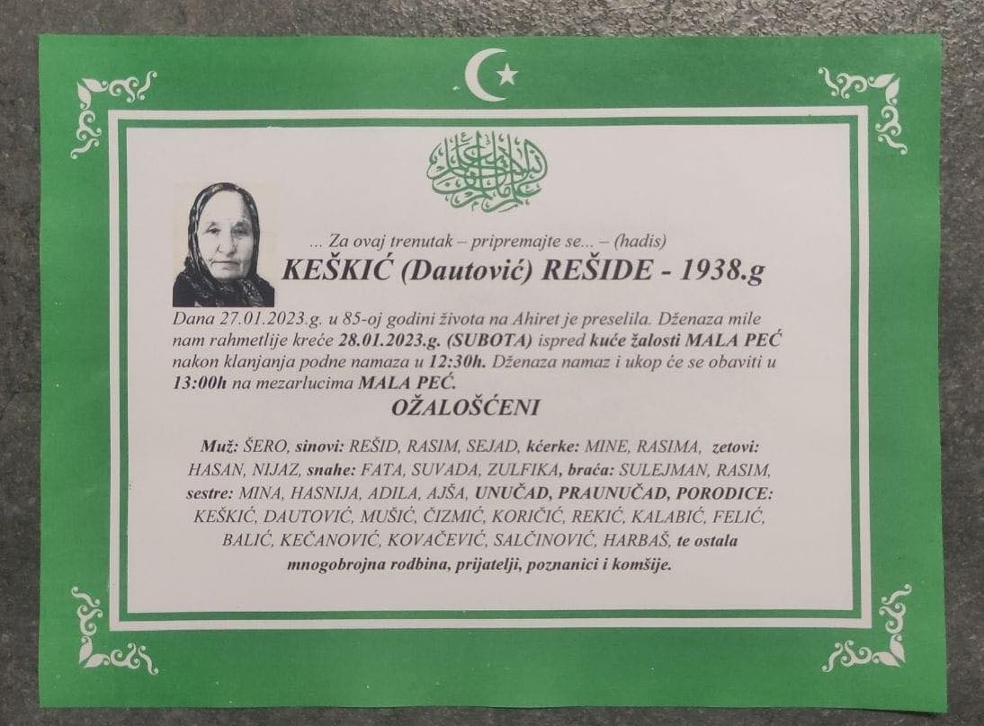Tužnim srcem i bolom u duši javljamo rodbini, prijateljima, komšijama i poznanicima da je dana 27.01.2023. godine u 85-oj godini života na Ahiret preselila Keškić (Dautović) Rešide.
