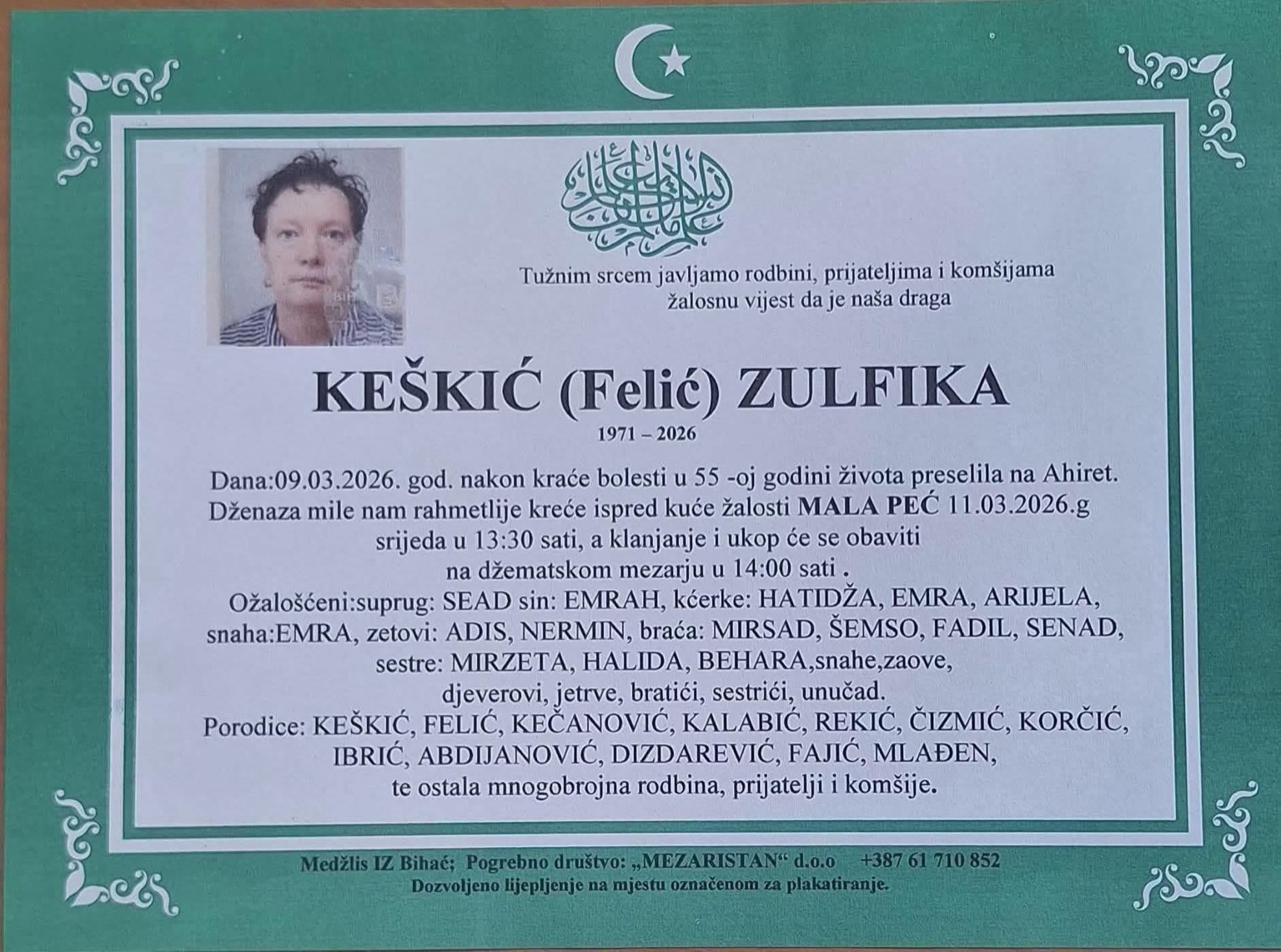 Dženaza mile nam rahmetlije kreće ispred kuće žalosti MALA PEĆ 11.03.2026. g. (srijeda) u 13:30 sati, a klanjanje i ukop će se obaviti na džematskom mezarju u 14:00 sati.