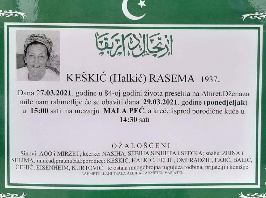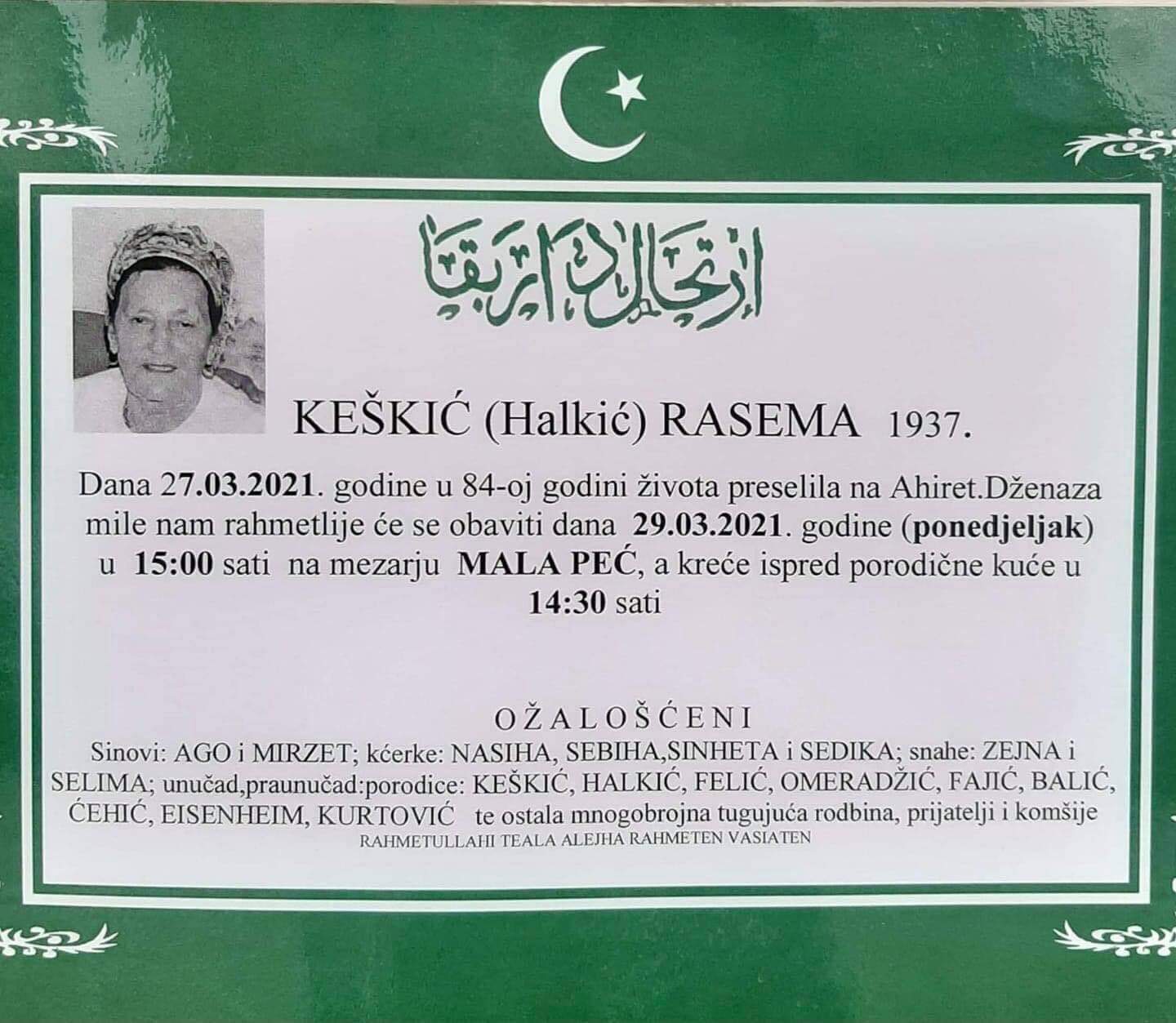 Tužnog srca i s bolom u duši obavještavamo rodbinu, komšije i prijatelje da je naša draga Keškić (Halkić) Rasema, dana 27.03.2021 godine, u 84-oj godini života, preselila na Ahiret.