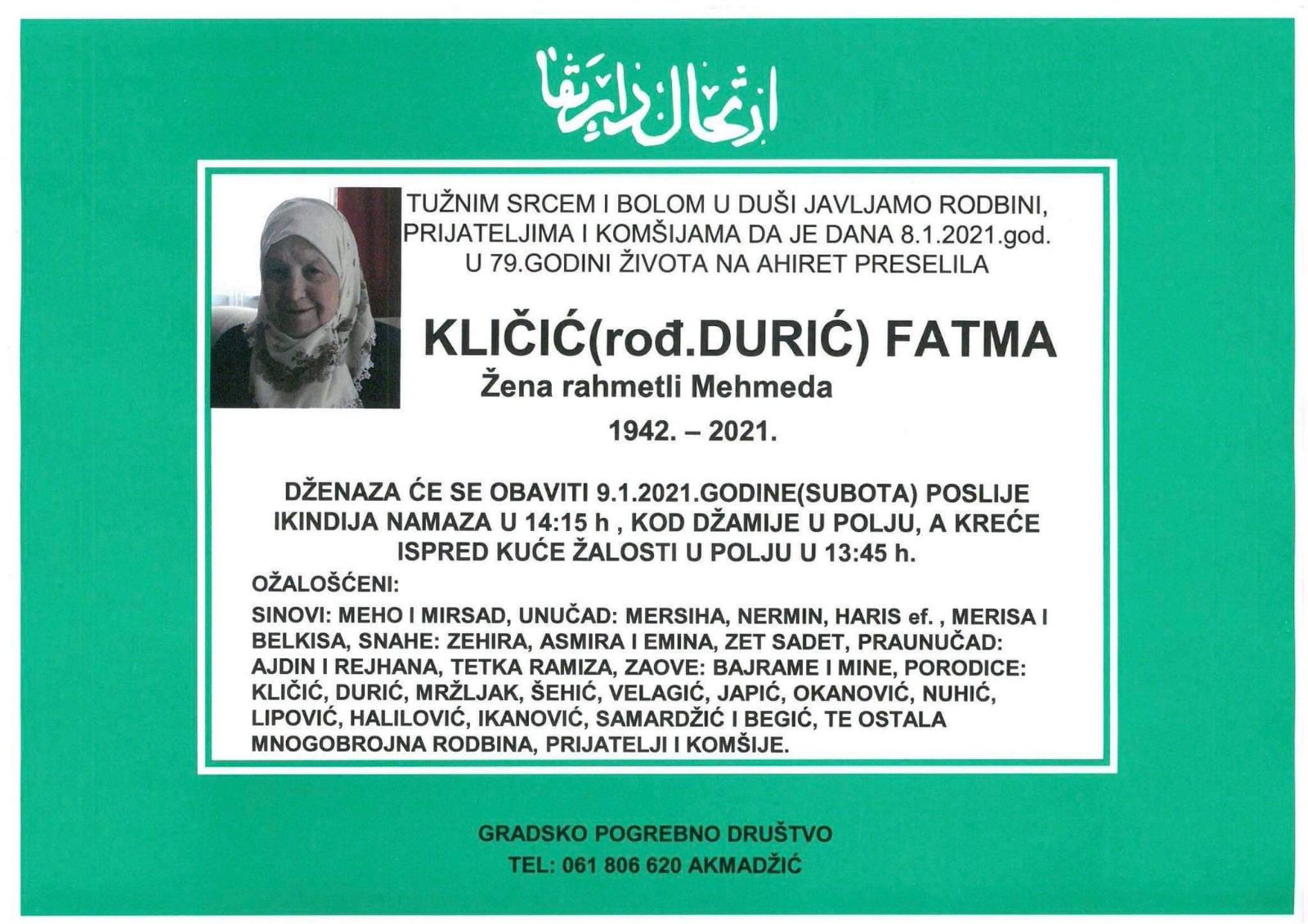 Tužnog srca i s bolom u duši obavještavamo rodbinu, komšije i prijatelje da je naša draga Kličić (rođ. Durić) Fatma, dana 08.1.2021. godine, u 79.-oj godini života, preselila na Ahiret.