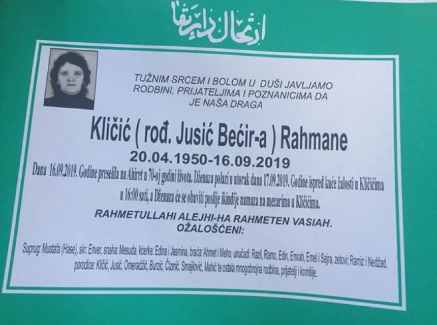 Tužnin srcem i bolom u duši javljamo rodbini, prijateljima i poznanicima da je naša draga Kličić (rođ. Jusić Bećir-a) Rahmane. Dana 16.09.2019.godine preselila na Ahiret u 70-oj godini života.