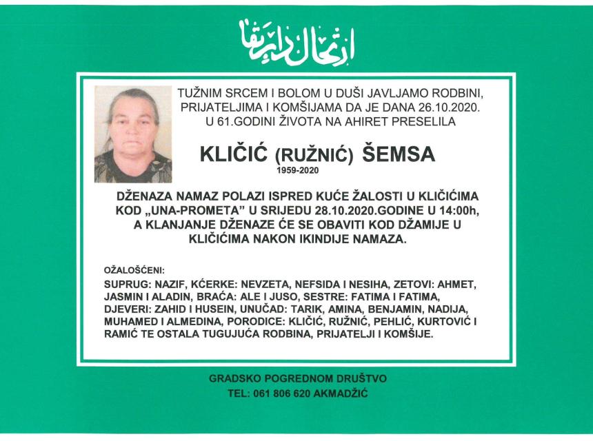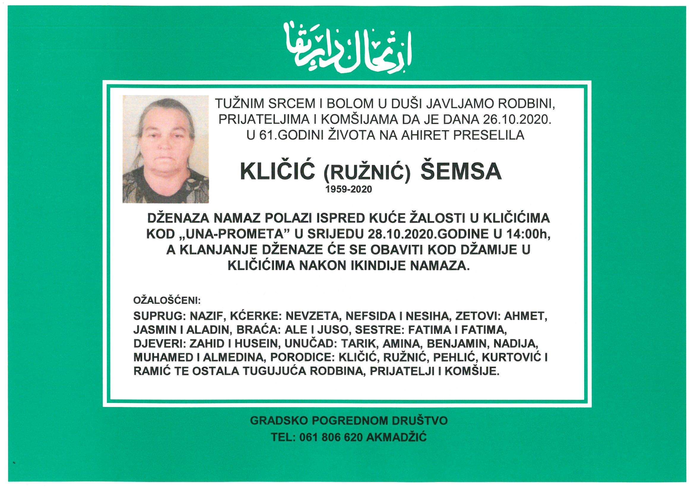 Tužnog srca i s bolom u duši obavještavamo rodbinu, komšije i prijatelje da je naša draga Kličić (Ružnić) Šemsa 26. oktobra 2020. godine, u 61. godini života, preselila na Ahiret.