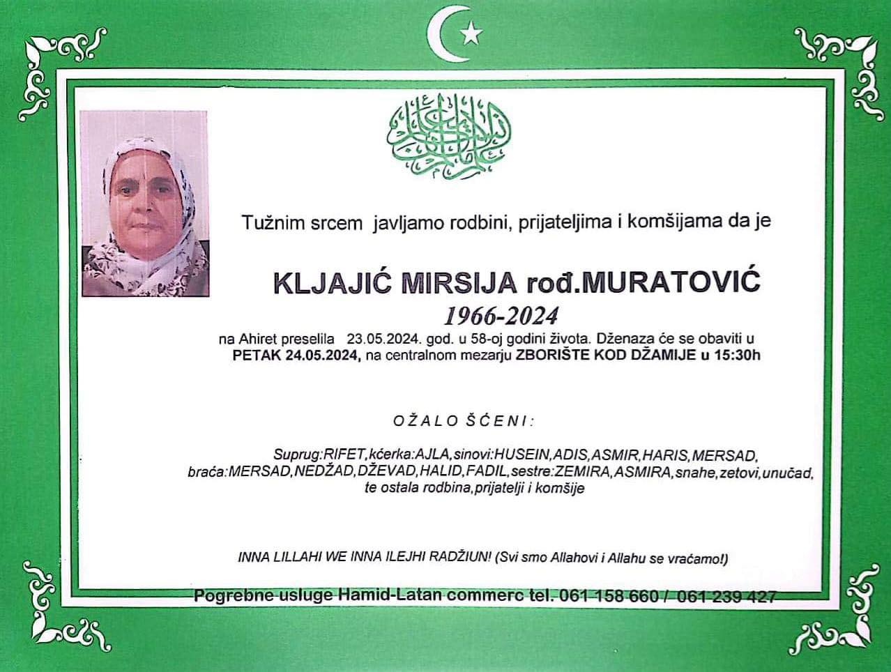 Tužnim srcem javljamo rodbini, prijateljima i komšijama da je Kljajić Mirsija rođ. Muratović na Ahiret preselila 23.05.2024. god. u 58-oj godini života.