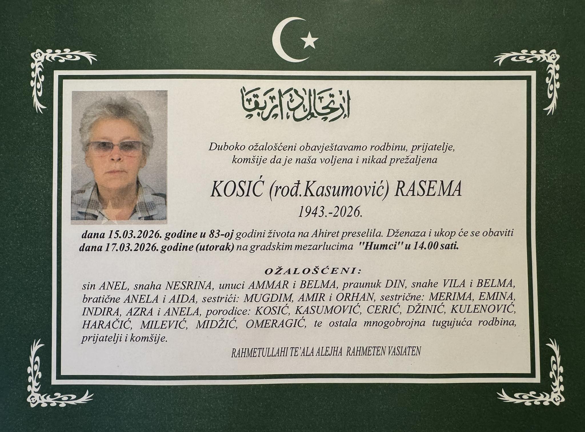 dana 15.03.2026. godine u 83-oj godini života na Ahiret preselila. Dženaza i ukop će se obaviti dana 17.03.2026. godine (utorak) na gradskim mezarlucima “Humci” u 14.00 sati.