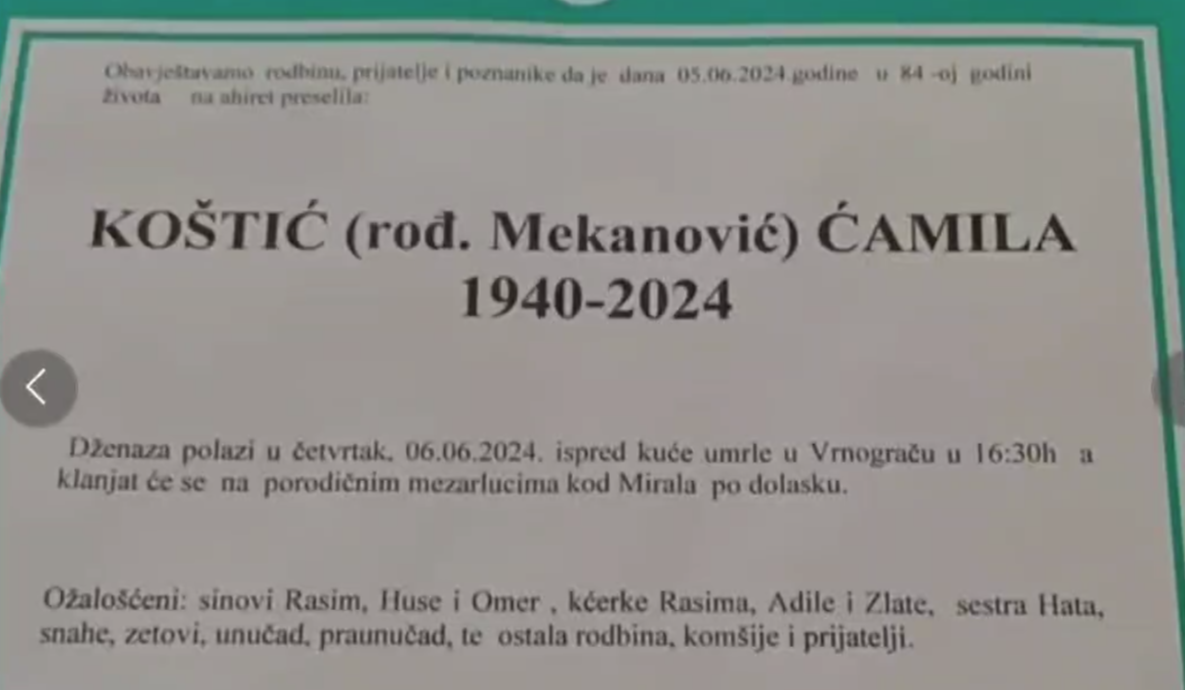 Tužnim srcem, javljamo rodbini, prijateljima i poznanicima da je naša draga Koštić (rođ. Mekanović) Ćamila, dana 05.06.2024. godine u 84. godini života preselila na Ahiret.