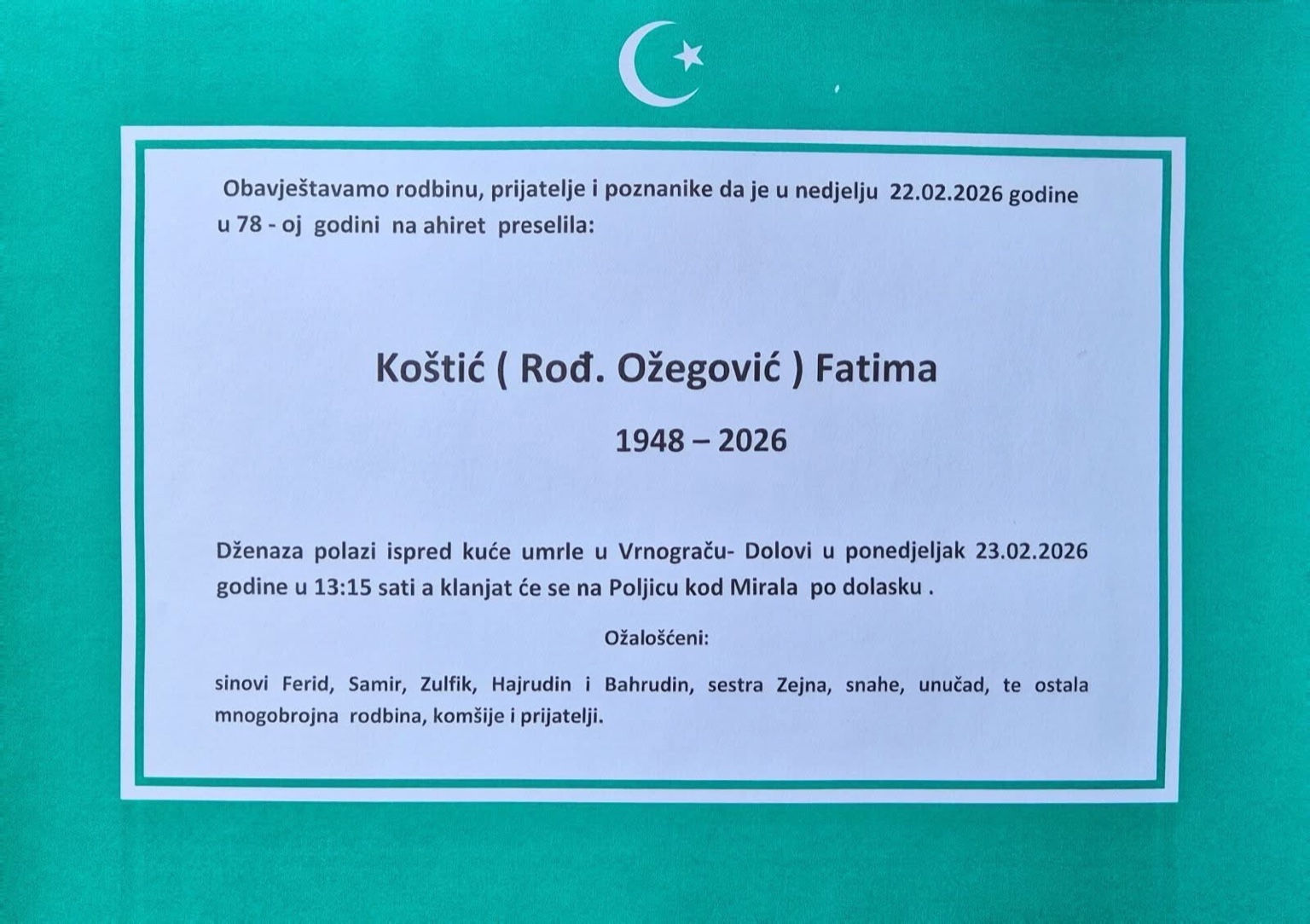 Dženaza polazi ispred kuće umrle u Vrnograču – Dolovi u ponedjeljak 23.02.2026. godine u 13:15 sati, a klanjat će se na Poljicu kod Mirala po dolasku.