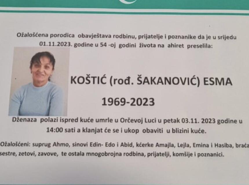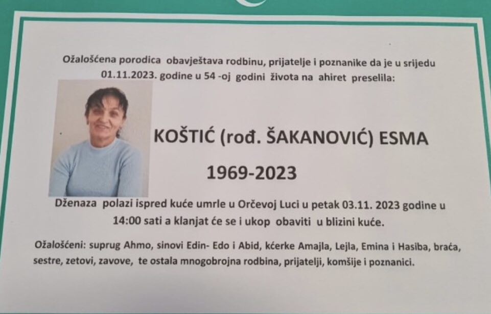 Ožalošćena porodica obavještava rodbinu, prijatelje i poznanike da je u srijedu 01.11.2023. godine u 54-oj godini života na Ahiret preselila KOŠTIĆ (rođ. ŠAKANOVIĆ) ESMA