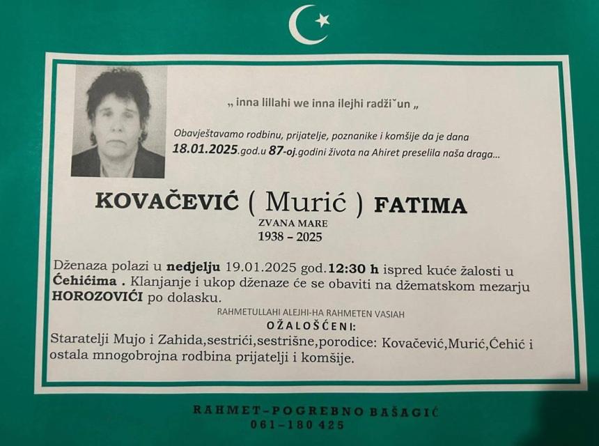Duboko ožalošćeni obavještavamo rodbinu, prijatelje i komšije da je dana 18.01.2025. god. u 87-oj godini života na ahiret preselila Kovačević (Murić) Fatima.