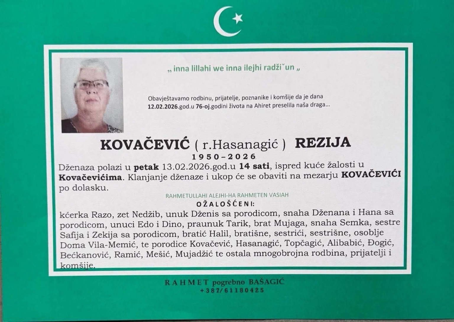 Dženaza polazi u petak, 13.02.2026. godine u 14 sati, ispred kuće žalosti u Kovačevićima.