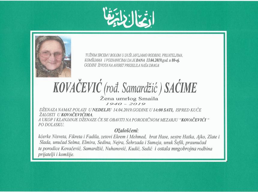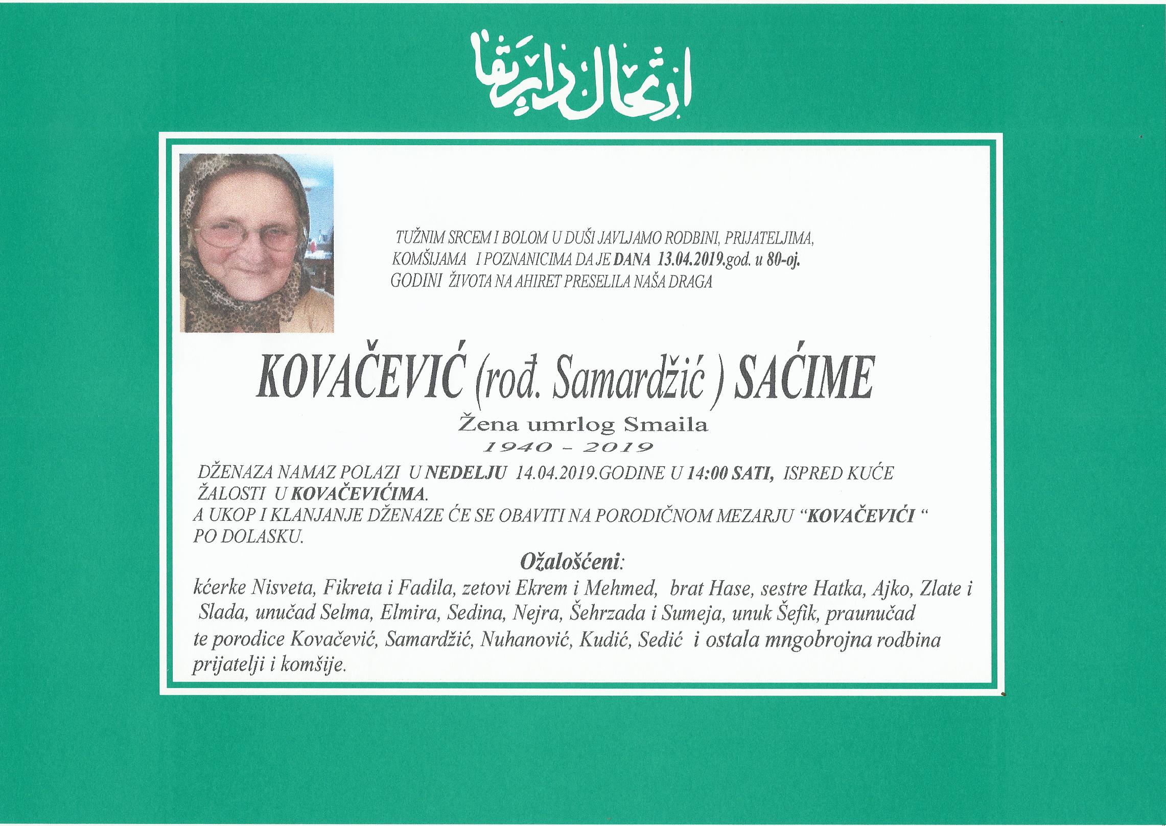 Tužnim srcem i bolom u duši javljamo rodbini, prijateljima i komšijama da je dana 13.04.2019. godine u 80-oj godini života na Ahiret preselila Kovačević (rođ. Samardžić) Saćime.