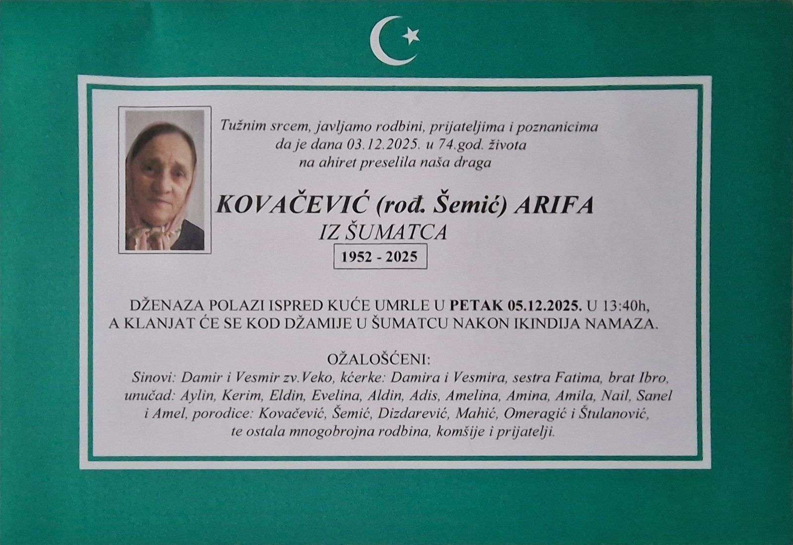 Tužnim srcem, javljamo rodbini, prijateljima i poznanicima da je dana 03.12.2025. u 74. god. života na ahiret preselila naša draga KOVAČEVIĆ (rođ. Šemić) ARIFA IZ ŠUMATCA.