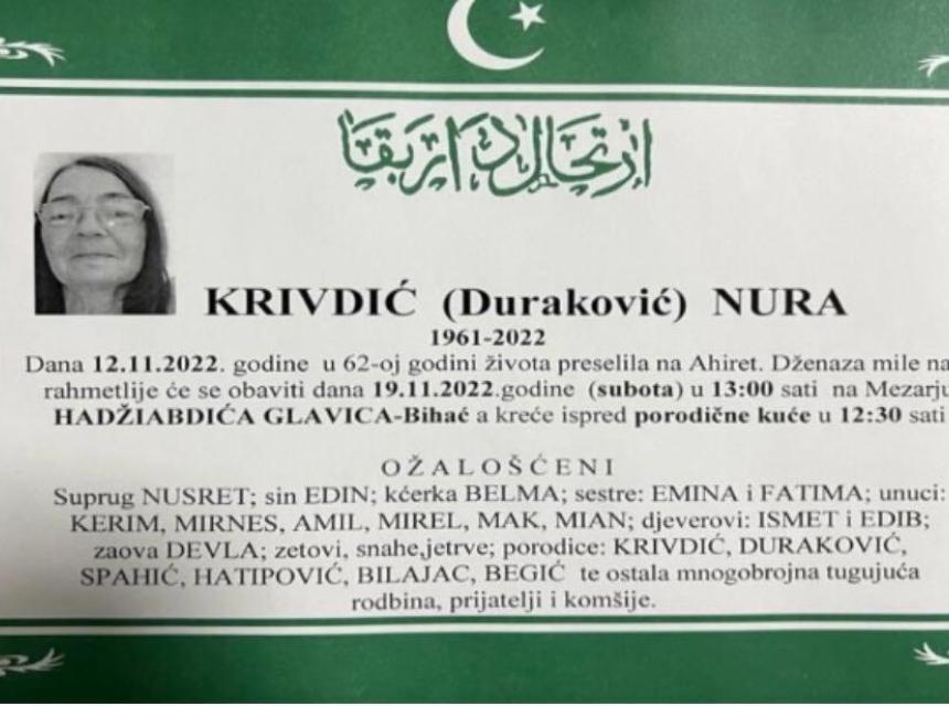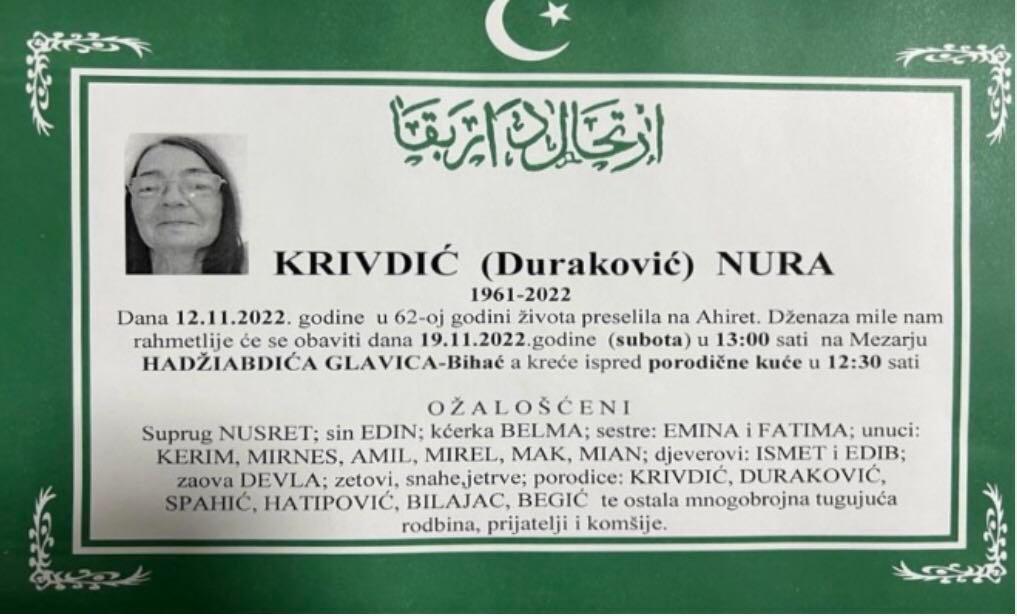 Tužnim srcem i bolom u duši javljamo rodbini, prijateljima i komšijama da je dana 12.11.2022. godine u 62-oj godini života na Ahiret preselila Krivdić (Duraković) Nura.