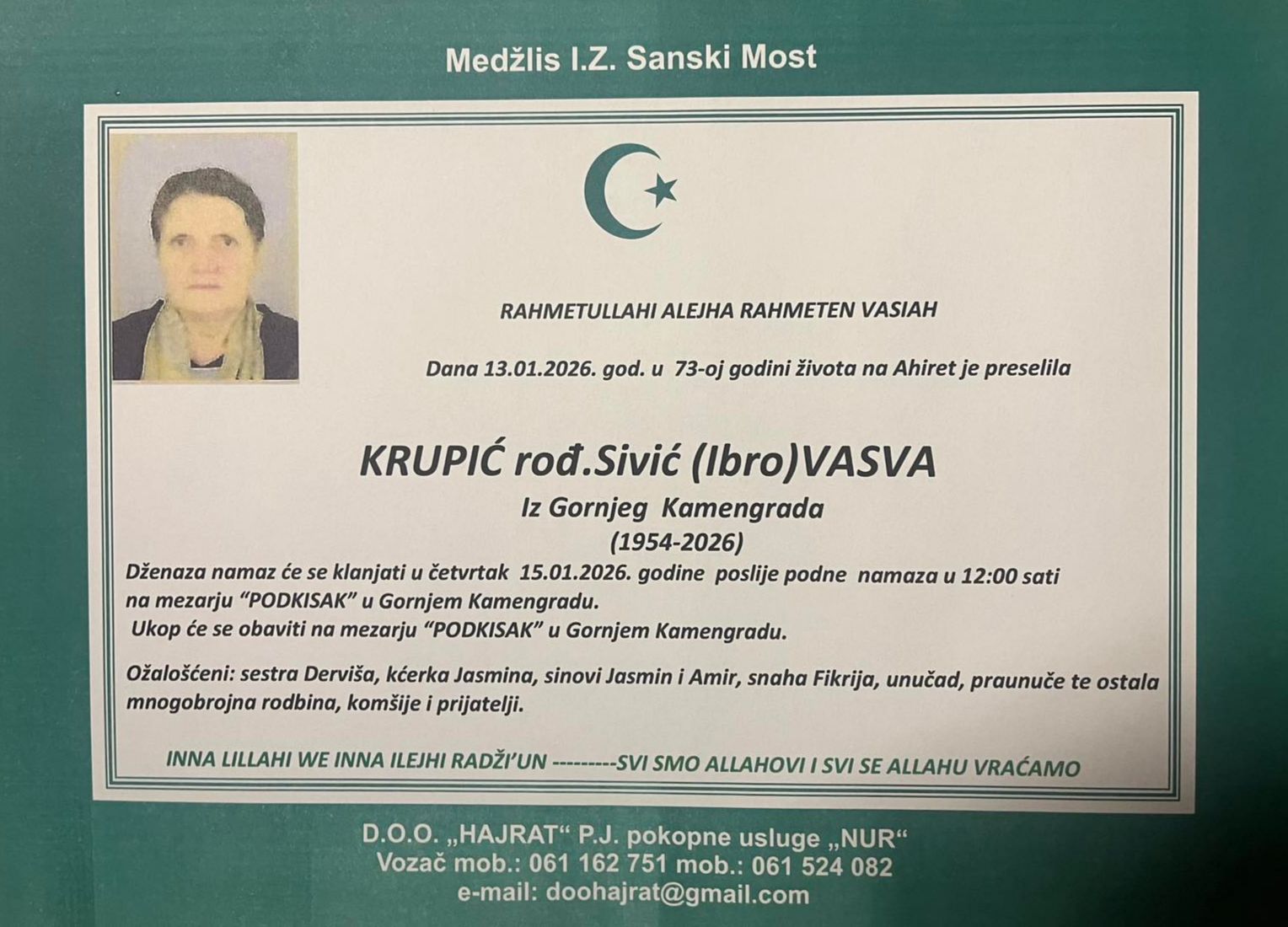 Dana 13.01.2026. god. u 73-oj godini života na Ahiret je preselila KRUPIĆ rođ.Sivić (Ibro) VASVA iz Gornjeg Kamengrada