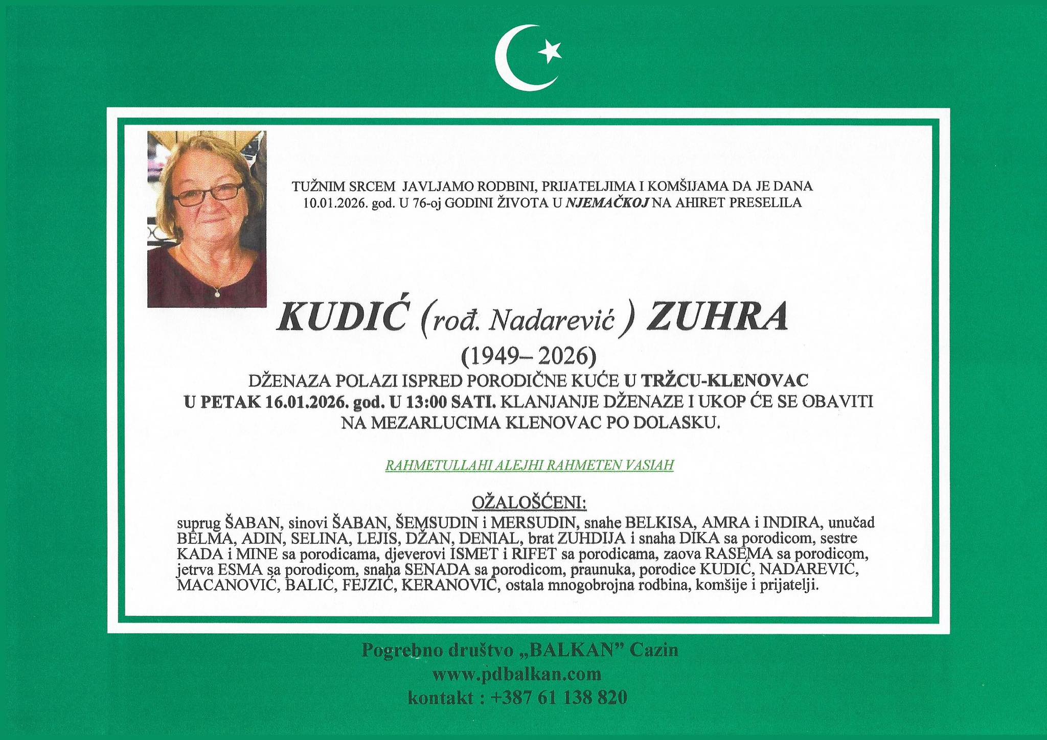 TUŽNIM SRCEM JAVLJAMO RODBINI, PRIJATELJIMA I KOMŠIJAMA DA JE DANA 10.01.2026. god. U 76-oj GODINI ŽIVOTA U NJEMAČKOJ NA AHIRET PRESELILA