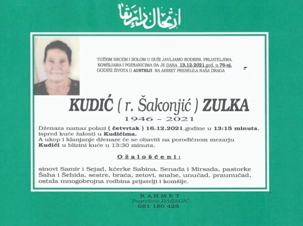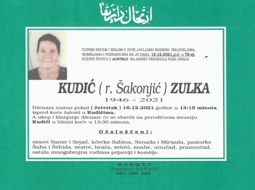 Tužnog srca i s bolom u duši obavještavamo rodbinu, komšije i prijatelje da je naša draga Kudić (rođ. Šakonjić) Zulka, dana 13.12.2021. godine, u 76-oj godini života, preselila na Ahiret.