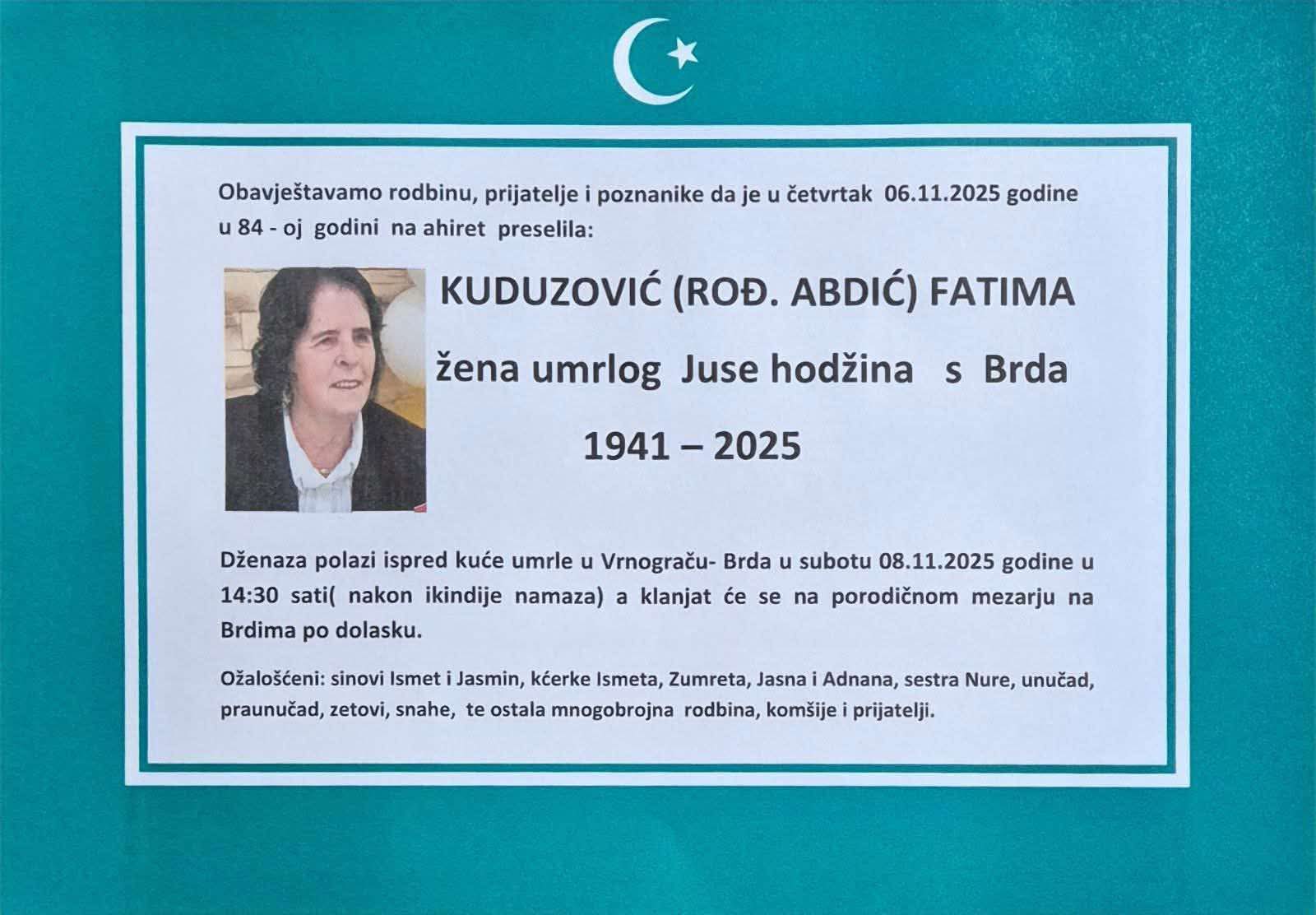 Dženaza polazi ispred kuće umrle u Vrnograču – Brda u subotu 08.11.2025. godine u 14:30 sati (nakon ikindije namaza) a klanjat će se na porodičnom mezarju na Brdima po dolasku.